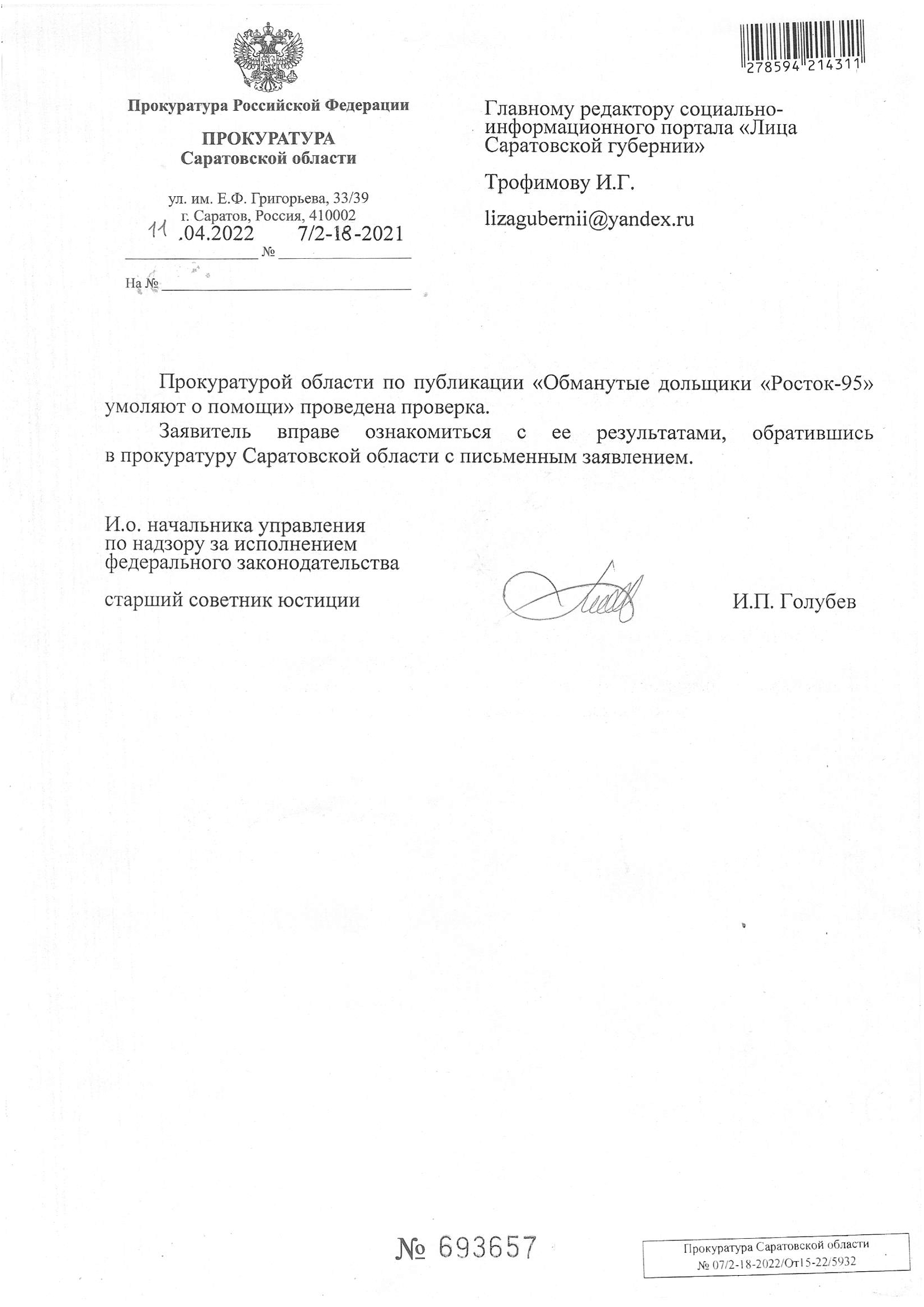 · Исх. вице-губернатора Саратовской области-Председателя Правительства Саратовской области №18-28/1082 от 12.11.2021г. заверили нас, что в ноябре 2021г. денежные компенсации дольщикам 7-го этажа будут выплачены и дом будет сдан.