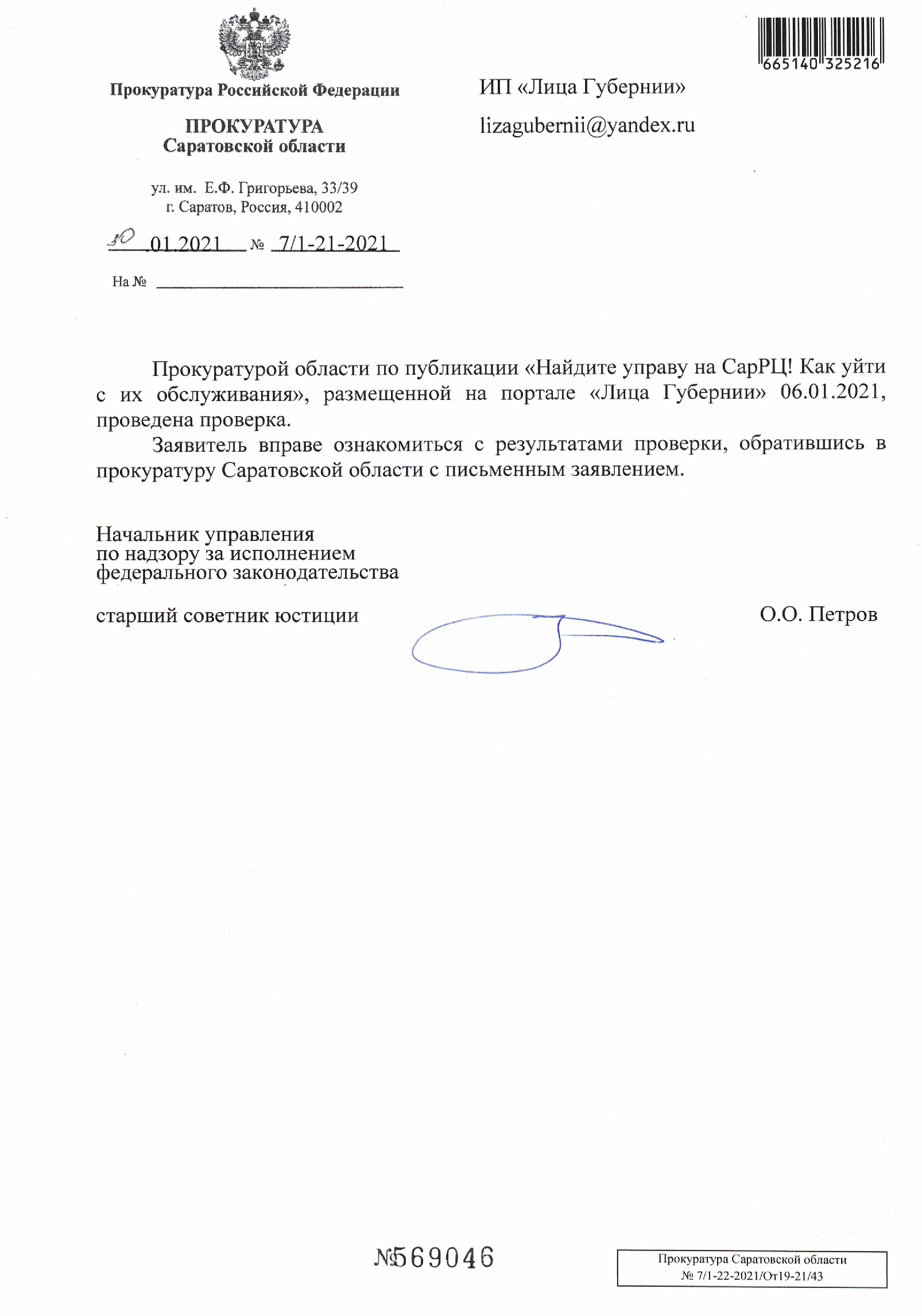 ПРОШУ ПРИВЛЕЧЬ К ДИСЦИПЛИНАРНОЙ ОТВЕТСТВЕННОСТИ прокурорских работников, которые самостоятельно не передали материалы в СУ СК РФ по Саратовской области в начале рассмотрения материалов по выселяемым семьям, а ждали моего обращения, сделанного через портал Госуслуги.