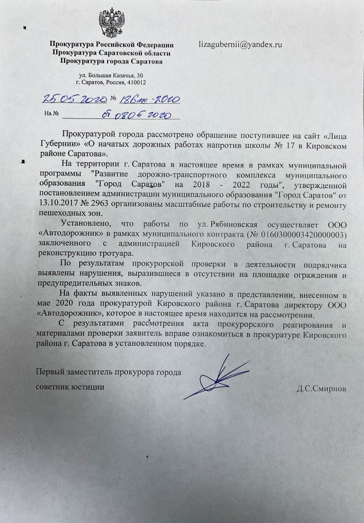 Жители нашего микрорайона "1 - ая Дачная" по ул. Рябиновская 27.04.2020 были очень удивлены начавшимися дорожно-строительными работами по ремонту тротуара , проводимыми напротив школы № 17. При этом нам так и не удалось выяснить кто и почему их производит - не у рабочих подрядной организации , не в отделе благоустройства администрации Кировского района г. Сартова . Информационный щит около места выполнения работ - просто отсутствует. Просим првести прокурорскую проверку - кто и на основании чего производит эти дорожно-строительные работы по ремонту тротуара .
