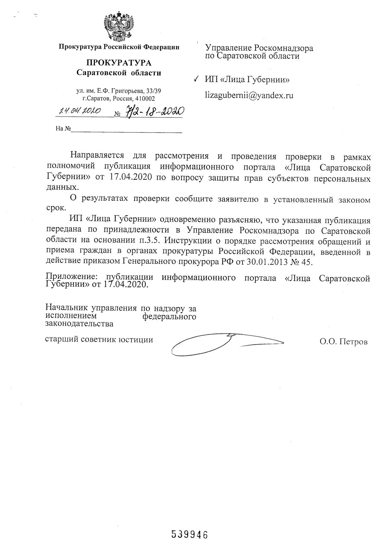 На основании Закона о Прокуратуре прошу дать правовую оценку действиям медикам по результатам публикации: http://lizagubernii.ru/news/389063/testov-net-postoite-v-storonochke-saratovchanka-rasskazala-kak-neskolko-dnei-pytalas-sdat-analizy-na-koronavirus-i-chto-iz-etogo-vyshlo-.html