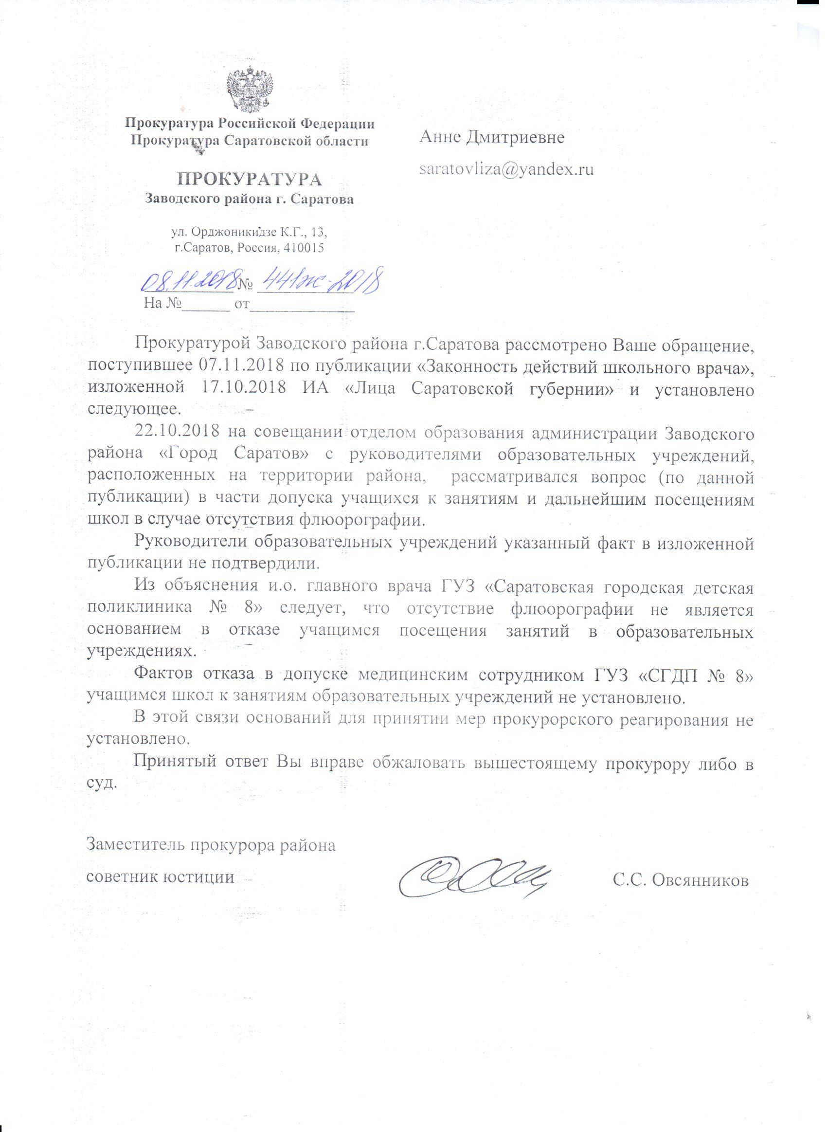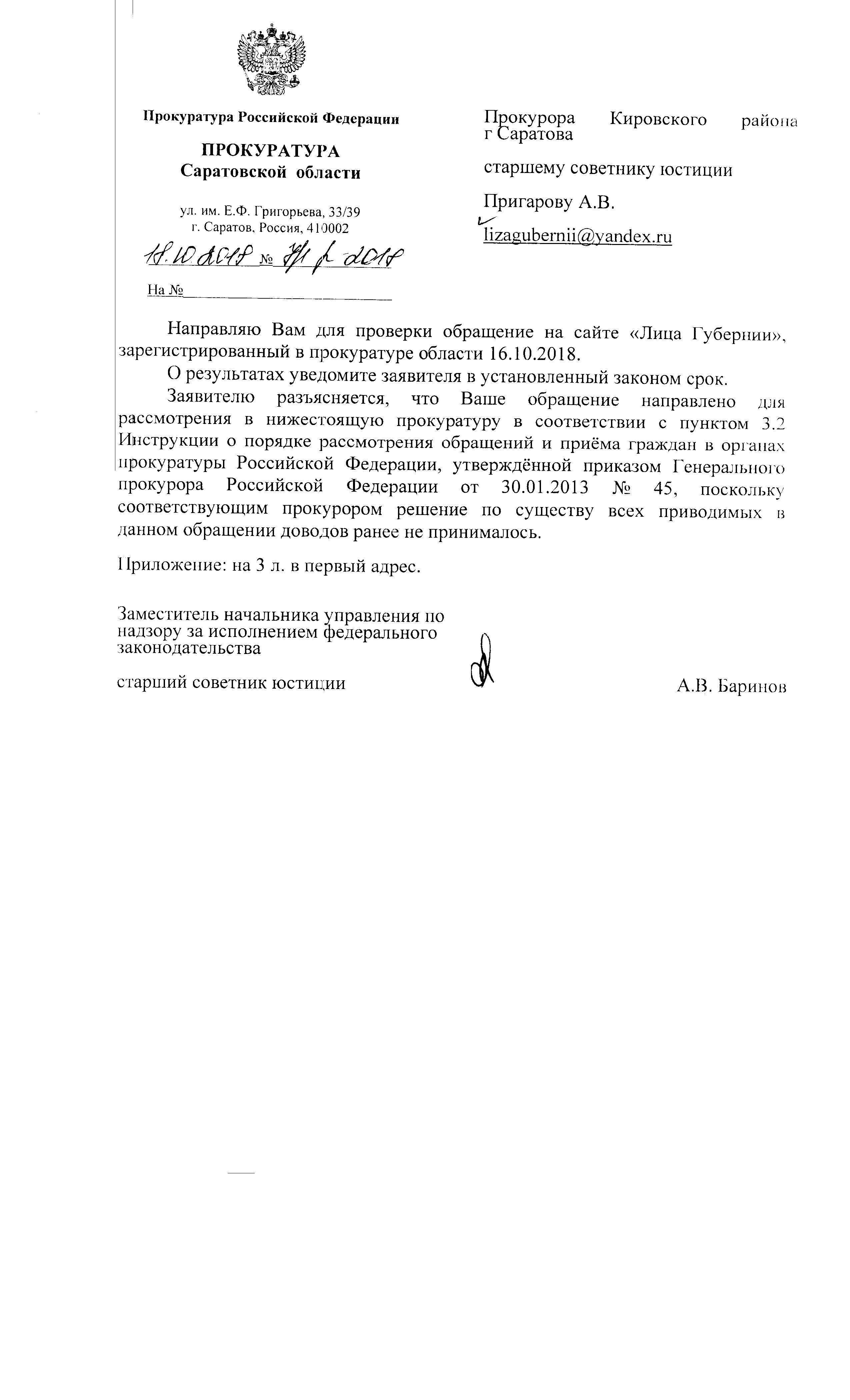 Уважаемый Сергей Владимирович! Прошу Вас дать поручение прокурору Заводского района города Саратова оценить законность действий врачей детской поликлиники номер 8.