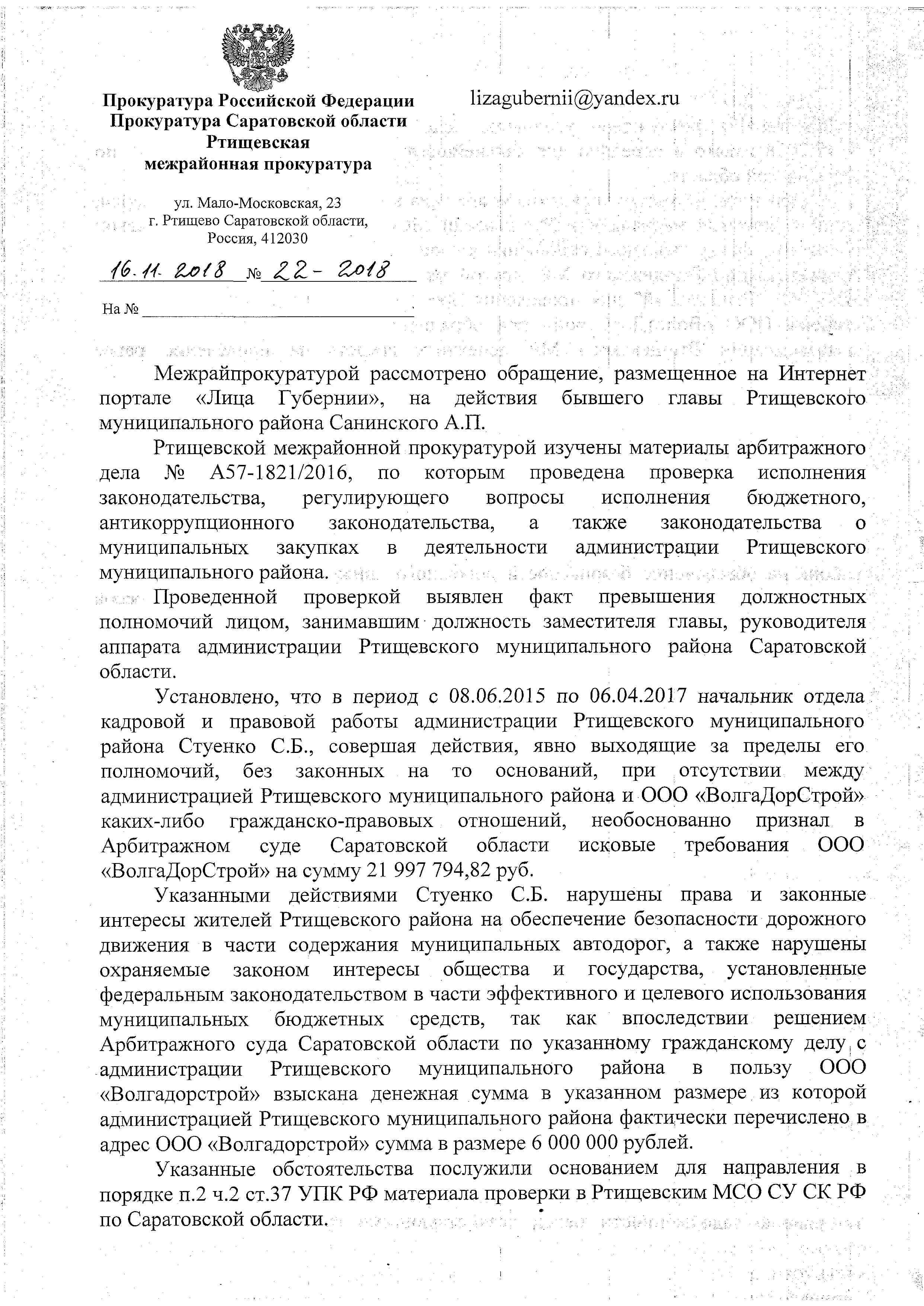 В частности сообщается: - "В Саратовской области перед судом предстанет бывший сотрудник администрации Ртищевского района. Чиновник обвиняется в превышении должностных полномочий. Как сообщили в пресс-службе СУ СКР, в феврале 2016 года в суд поступило заявление от компании из Волгограда. Организация хотела возместить 22 млн рублей за ремонт дороги в Ртищевском районе. В марте этого года, представляя интересы органа местного самоуправления в Арбитражном суде, чиновник без законных на то оснований, при отсутствии между администрацией и организацией-истцом каких-либо договорных отношений, необоснованно признал выдвинутые требования.«За период с июня 2016 года по апрель 2017 года администрация Ртищевского муниципального района перечислила подрядчику 6 млн рублей. В результате противоправных действий обвиняемого бюджету причинен ущерб на указанную сумму», - уточнили в управлении".