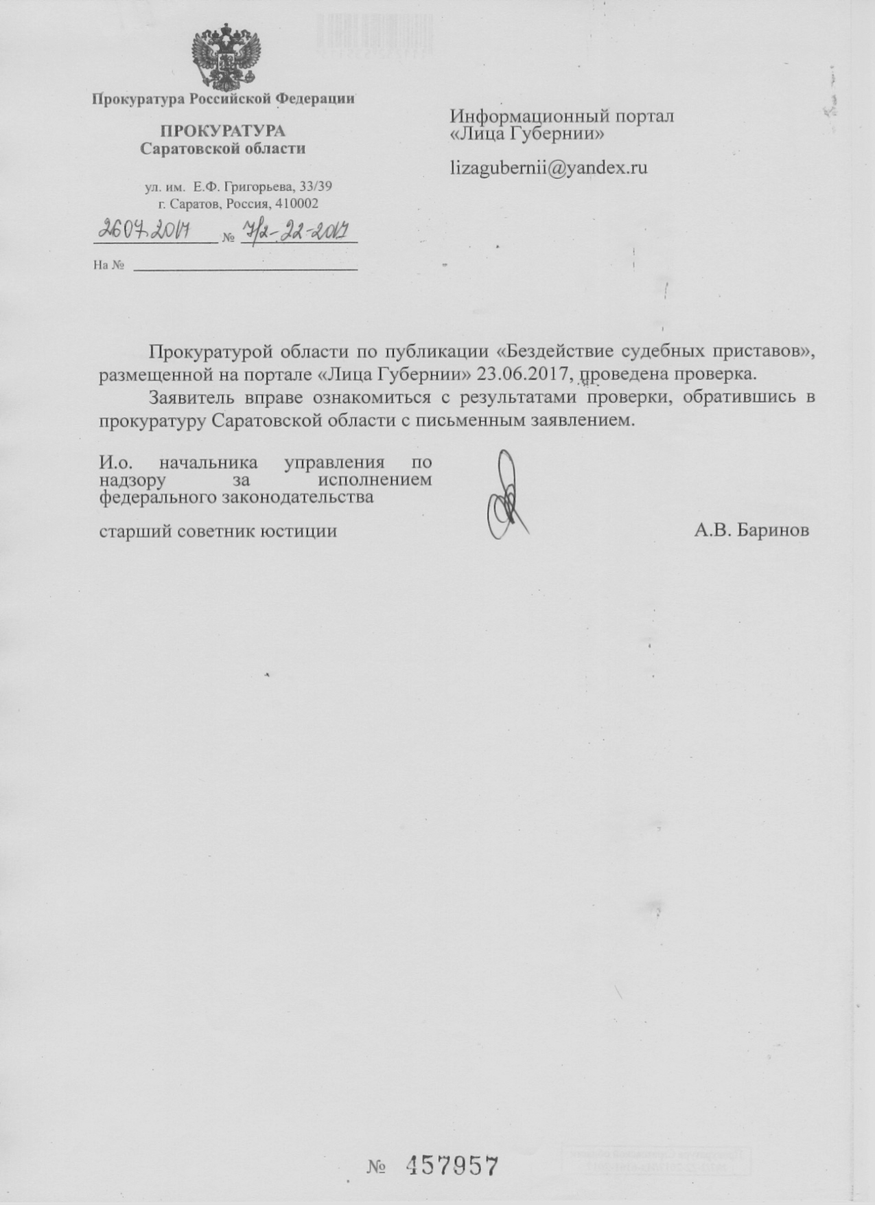 Возбуждено исполнительное производство № 544/16/64031-ИП от 18 января 2016 г. Там задолженность составляет более 400 000 тысяч рублей, которую должник не оплачивает вообще. 06 декабря 2016 г. я обратилась Ртищевскую межрайонную прокуратуру Саратовской области с жалобой на приставов. Ничего не изменилось.