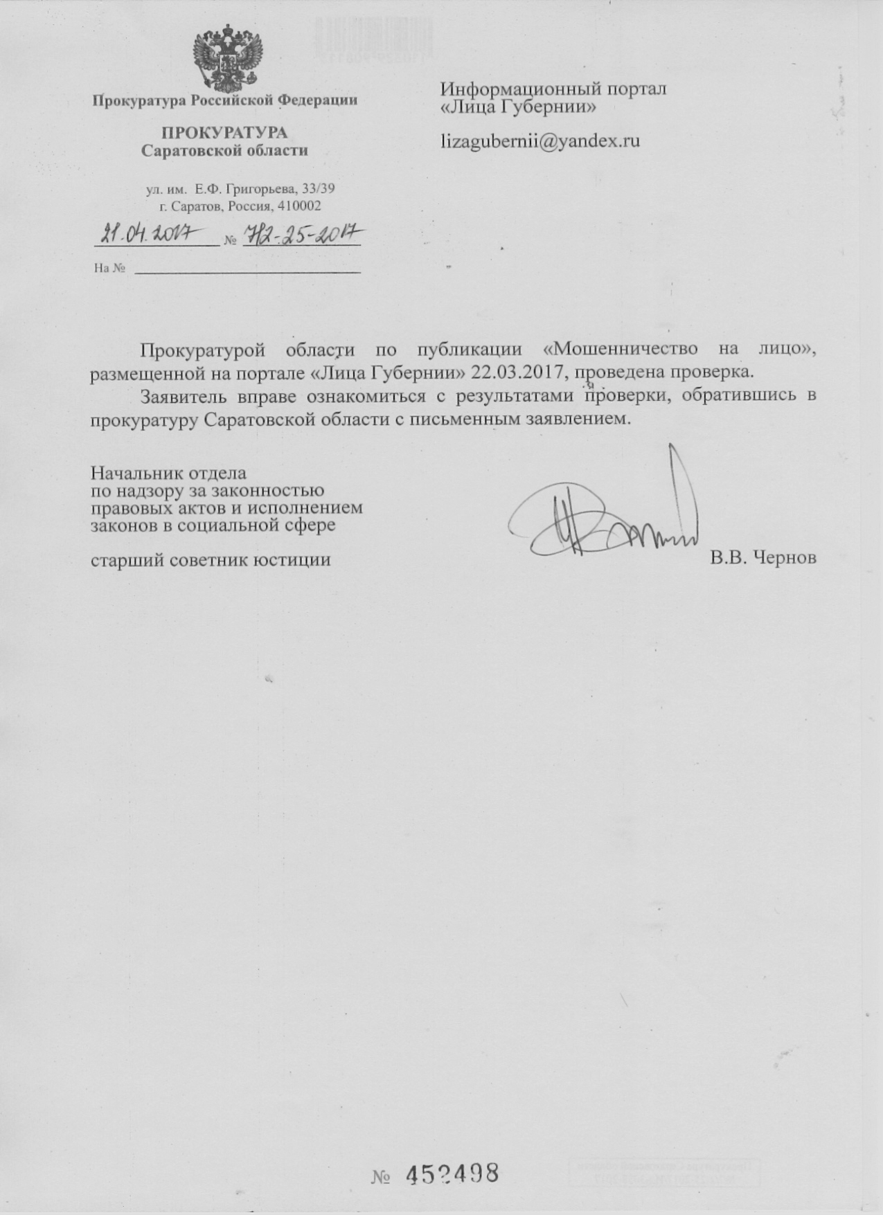 Прокурору Саратовской области Филипенко С.В. 410002 Саратов, ул. им. Е.Ф.Григорьева, д.33/39 от представителя по доверенности Готфрид Таисии Викторовны, проживающей по адресу: г. Маркс, ул. Северная, дом №18 с.т. 8 937 222 70 40 действующей в интересах Щекалёвой Марии Дмитриевны, проживающей по адресу: 108852, г. Москва, г.о. Щербинка ул. Остафьевская дом № 14 кв.32 с.т.8 967 027 29 07