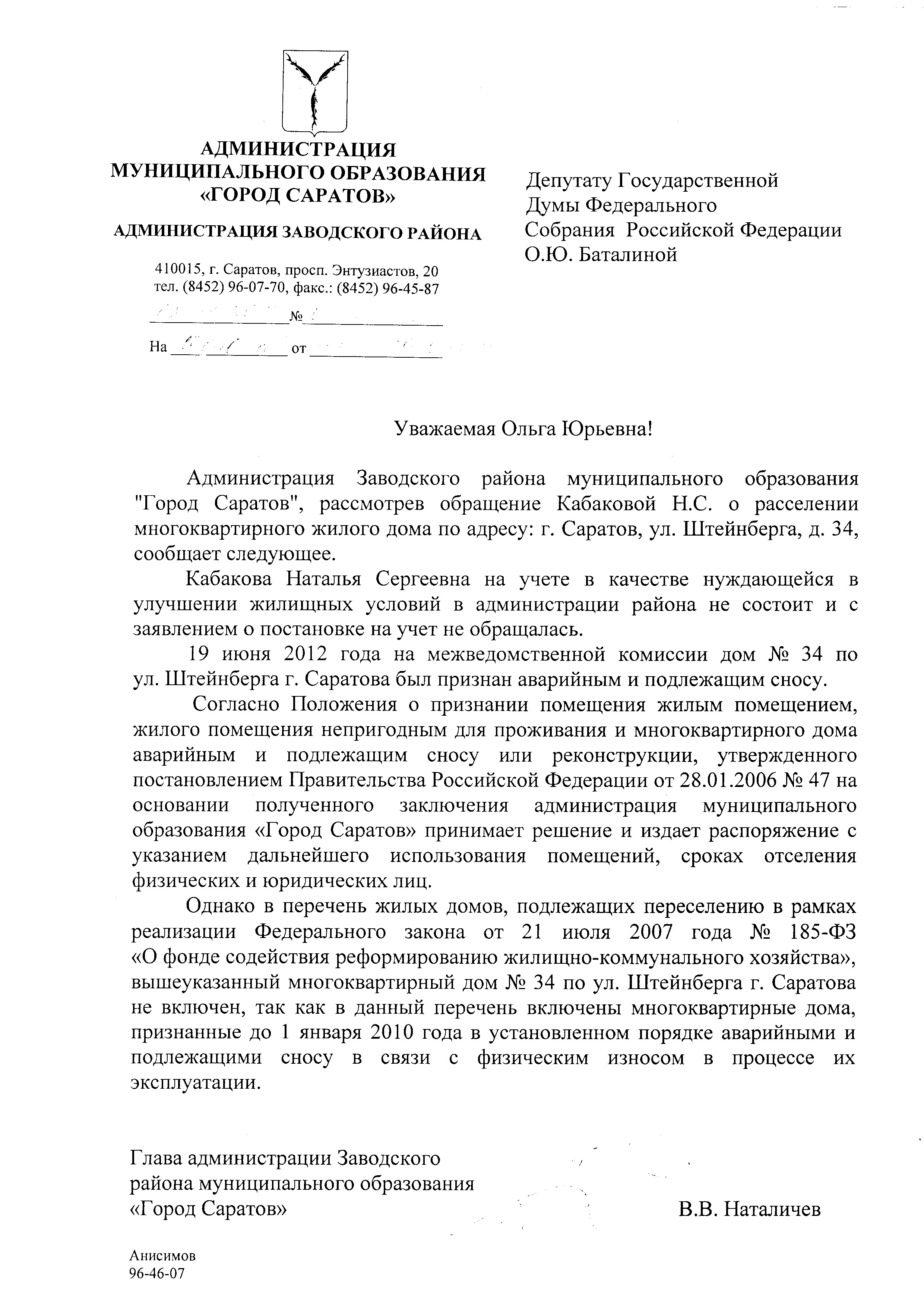 Уважаемая Наталья! Для выяснении Вашей ситуации мною направлен запрос в администрацию Заводского района г. Саратова. После получения ответа Вы будете дополнительно проинформированы.