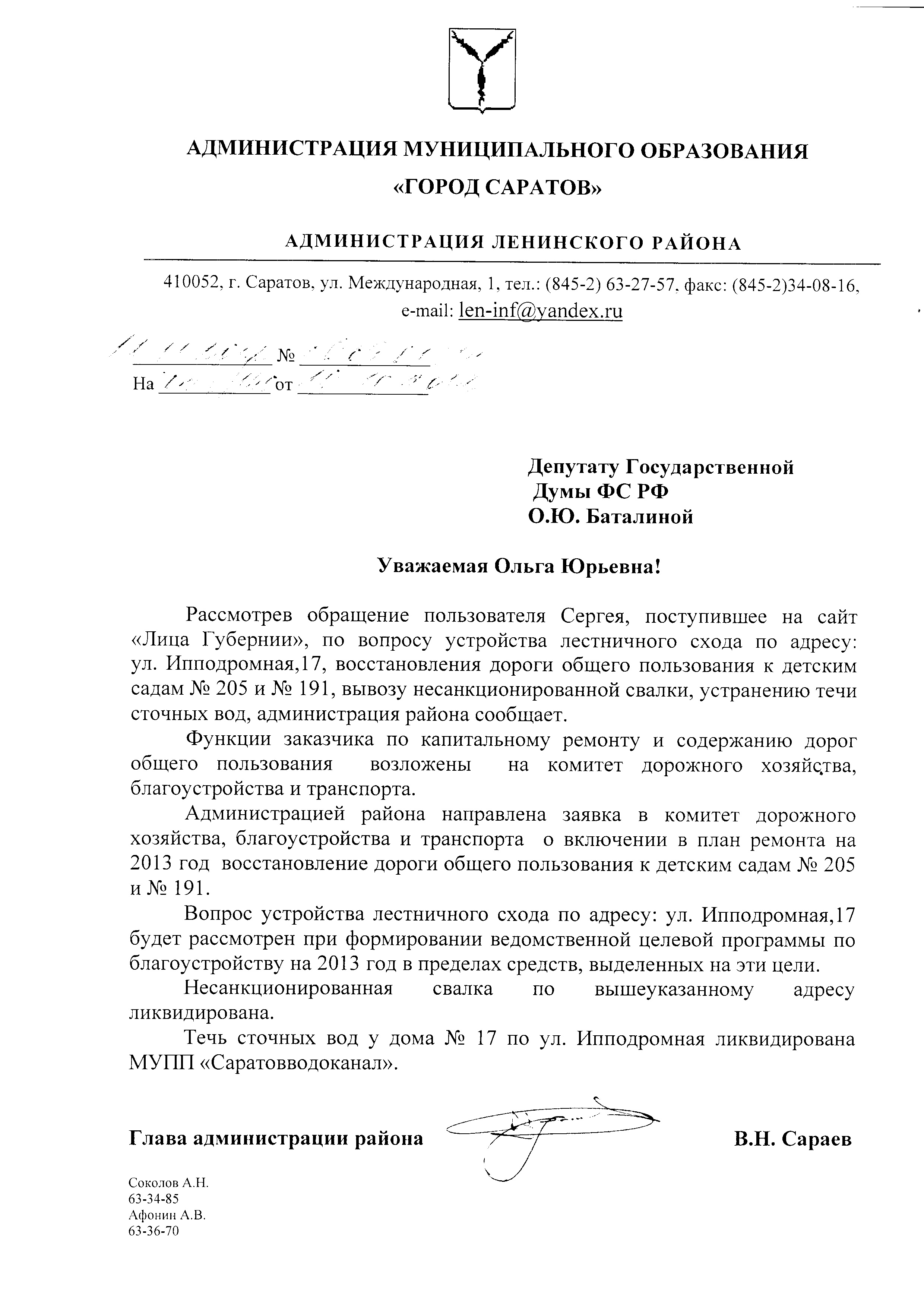 Уважаемый Сергей! По Вашему обращению мною направлен запрос в администрацию Ленинского района г. Саратова. После получения ответа Вы будете дополнительно проинформированы.