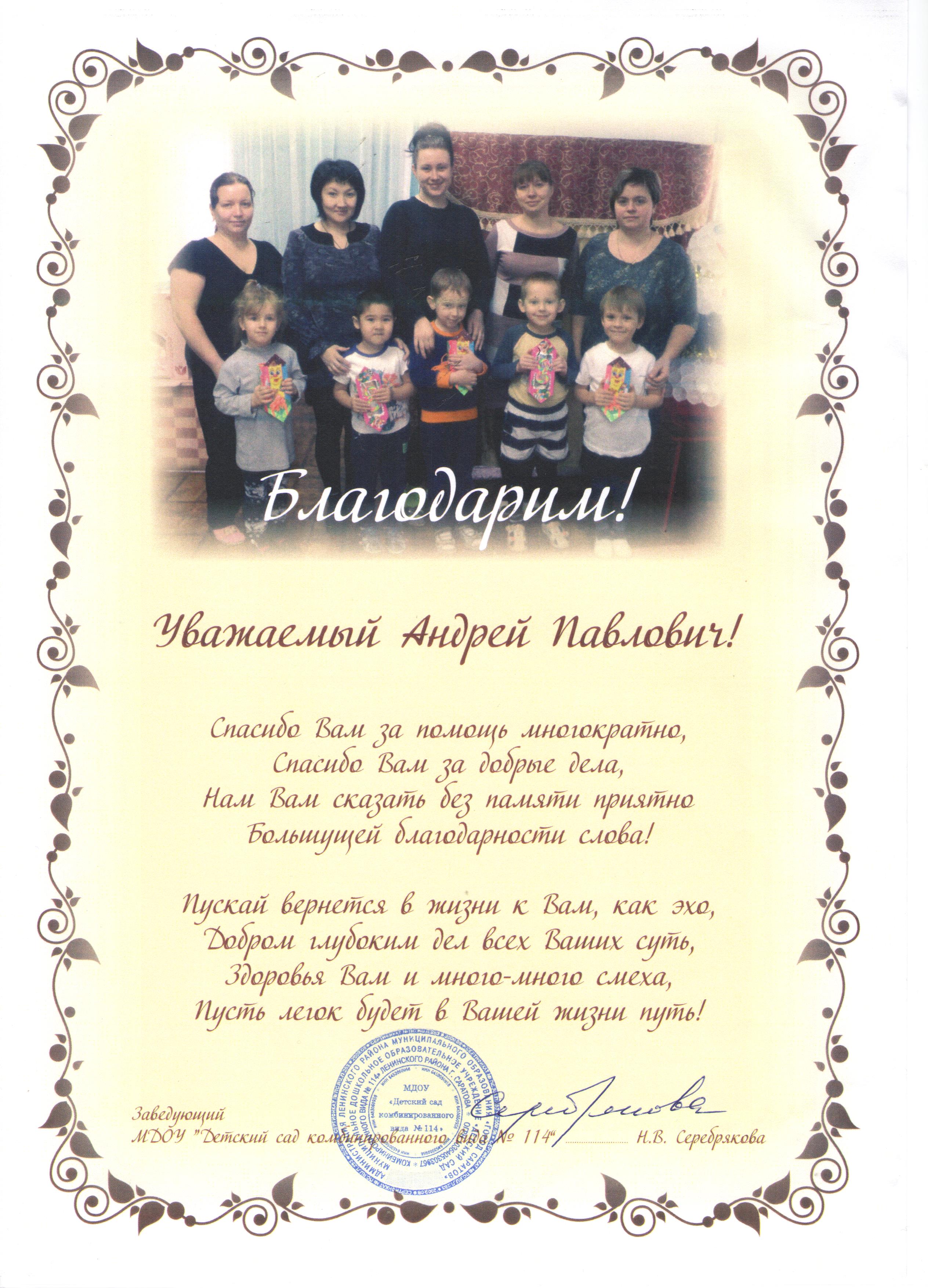 Уважаемый Василий Юрьевич! Выражаю Вам благодарность и глубокое уважение за Ваше доброе сердце и внимательное отношение к проблемам людей. Свою проблему я озвучила вам на приеме граждан по личным вопросам в Питерском районе и даже не ожидала, что к мой вопрос будет решен положительно в кратчайшие сроки. Очень радует, что Ваши слова не расходятся с делом и про каждого обратившегося к вам гражданина вы помните и помогаете. Хочется пожелать Вам здоровья прежде всего, сил и успеха во всех Ваших начинаниях!!! Киреева Елена, с.Питерка.