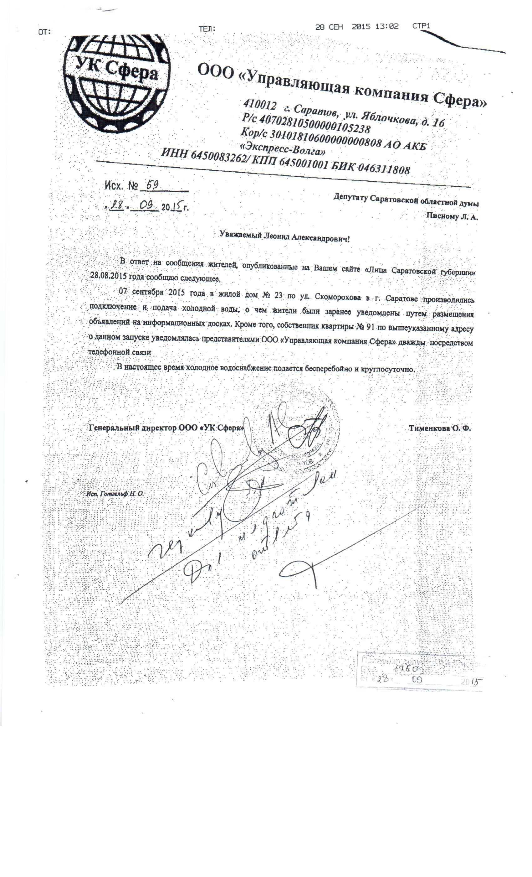 Леонид Александрович, добрый день! Пишу от имени жильцов дома 23 по ул.Скоморохова. Мой телефон 8927-2279249. В нашем доме не включают воду. В УК Сфера ссылаются на Водоканал - они, мол, не подписывают договор. В Водоканале очень сложно выяснить, кто за это отвечает. Нам говорили, что договор на подключение услуги рассматривается в течение месяца. Месяц уже прошёл. Теперь каждую неделю в Сфере говорят - вода будет на следующей неделе. Выглядит как обычная отговорка. Лично мне не понятно, в чем проблема рассмотрения стандартного договора. Я сейчас снимаю квартиру. А квартира на Скоморохова куплена по ипотеке. Планировала переехать как можно быстрее, т.к. платить за 2 квартиры возможности просто нет. Пожалуйста, посодействуйте. Люди в нашем доме уже и ремонт без воды приспособились делать. Но жить-то без воды не получится. А ещё предстоит процесс подключения газа и отопления.