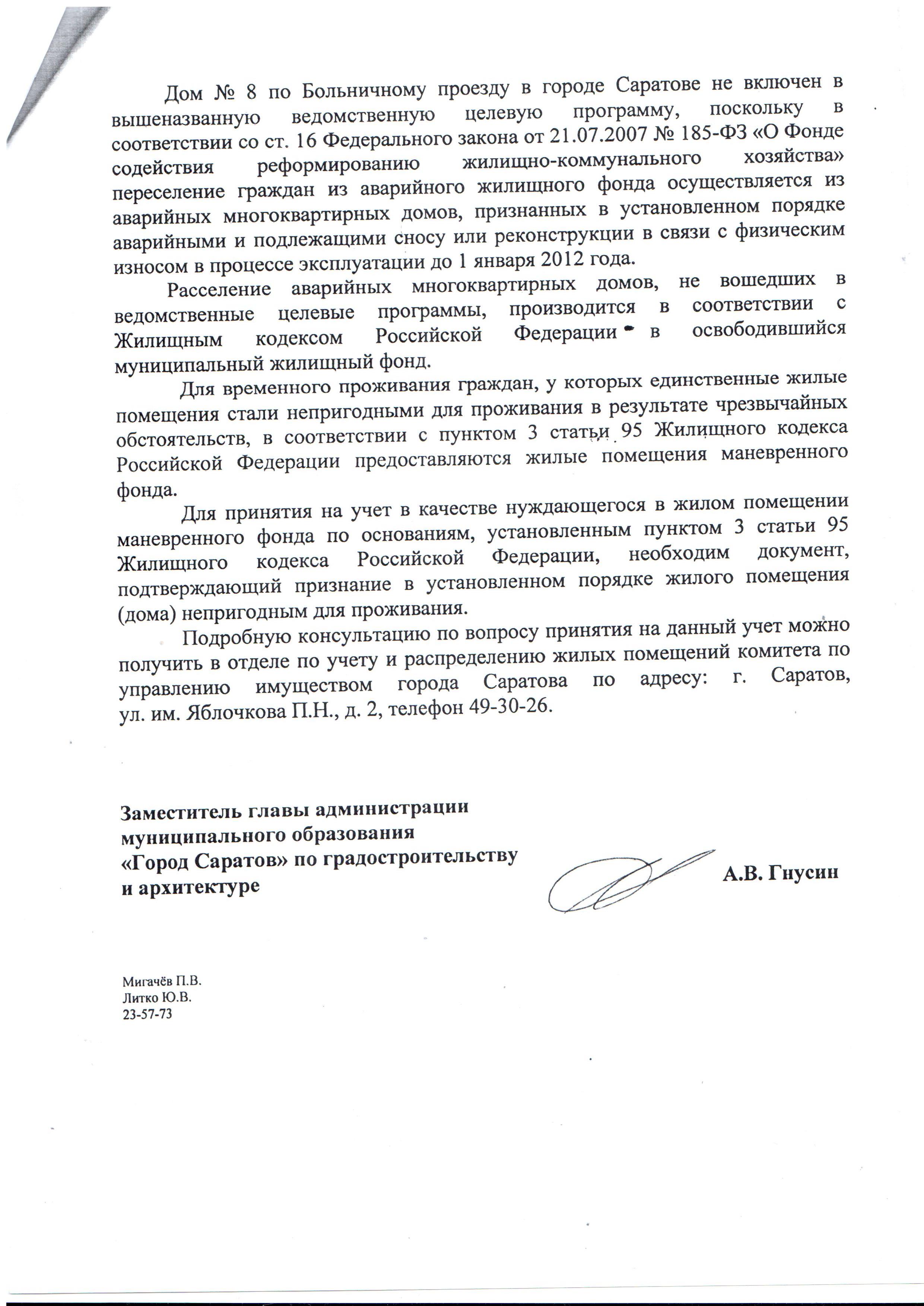 Здравствуйте Леонид Александрович! Вынуждена обратиться к Вам с вопросом, так как проживаю в г. Саратове Заводской район, ул. Больничный проезд, д. 8, кв. 1. Наш дом признан аварийным жильем и попадает под программу переселения из аварийного жилья. Так как наша квартира приватизированная, то нам отказывают в предоставлении нового жилья, а лишь предлагают сертификат, а жильцам нашего дома которые не приватизировали свое жилье, предоставляют новое. Вопрос на каком основании нам отказывают в новом жилье ???