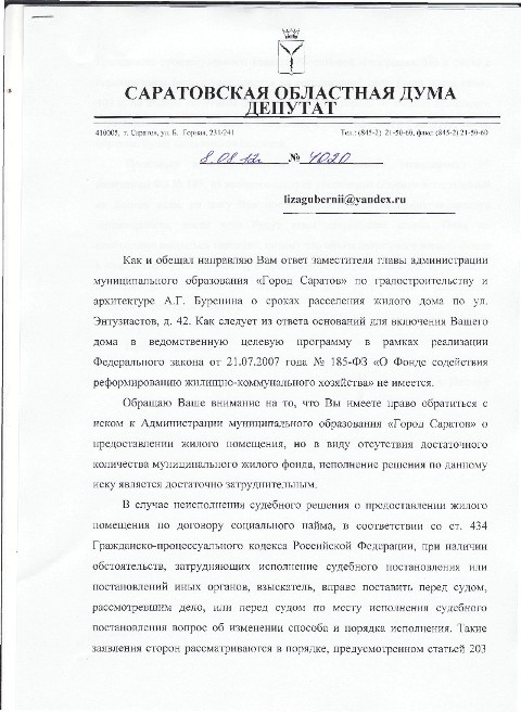 Расселение граждан из аварийных жилых домов осуществляется в городе Саратове на основании двух направлений. Первое – плановое расселение граждан в рамках программы «Переселение граждан из аварийного жилищного фонда», которое финансируется за счет федерального, регионального и местного бюджетов в соответствии с Федеральным законом №185 «О фонде содействия реформированию ЖКХ». В списке жилых домов-участников Программы за период 2008-2012 гг. Ваш дом не значится, да и не может там значиться, так как, судя по Вашей информации, Ваш дом был признан непригодным для проживания в ноябре 2011 года. Вторым направлением является предоставление жилых помещений в соответствии с исками и требованиями граждан и прокуратур соответствующих районов, которые направляли свои иски в защиту граждан, проживающих в аварийном жилом фонде. Эти иски направлялись в отношении администрации г. Саратова как по вопросам признания дома непригодным для проживания, так и по вопросам предоставления жилых помещений в рамках закона.