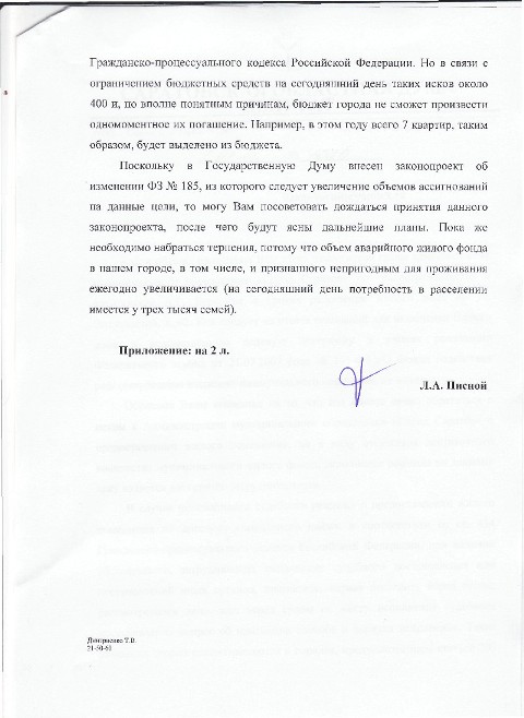 Уважаемый Леонид Александрович, Прошу разъяснить принцип мероприятий по расселению физических лиц из многоквартирного дома по адресу: г. Саратов, просп. Энтузиастов, дом № 42. Я являюсь собственником квартиры по проспекту Энтузиастов № 42 кв.№8. Получили распоряжение изданное Главой администрации муниципального образования «Город Саратов» А.Л. Прокопенко от 14 ноября 2011 года № 501-р, согласно которому собственники в течение трех месяцев со дня издания этого распоряжения должны произвести отселение из занимаемых помещений. Далее пунктом № 1.2 произвести снос указанного дома в срок до 23 августа 2012г. В какое жилье, собственники аварийного дома по вышеуказанному адресу, должны произвести отселение. Хочу обратить ваше внимание на то, что, квартира по просп. Энтузиастов, дом № 42 это единственное жилье в котором я проживаю. Другой недвижимостью не обладаю. Какая организация должна заниматься предоставлением компенсаций или иного жилья собственникам, проживающим в помещении под снос. И как нам понимать пункт №1.2 распоряжения администрации муниципального образования «Город Саратов» от 14 ноября 2011 года № 501-р. В котором буквально указывается, в разделе собственникам жилья, произвести снос. На каких основаниях Администрация Заводского района муниципального образования «Город Саратов» должна не допускать повторного заселения, если отселения невозможно, по причине отсутствия другого жилья. Жилье действительно непригодное для проживания, в холодный период времени не держит тепло совершенно. Зимой доходит до 8 градусов. В УК говорят, что не виноваты в таком состоянии дома и предлагают сделать ремонт собственникам. На 8 квартир 3 квартиры собственников, для ремонта сумма даже по федеральному закону очень велика получается. Неужели придется ждать долгие годы в таких условиях пока администрация найдет средства. Ведь программа по ликвидации ветхого жилья в этом году заканчивается. Мой телефон 89179814832