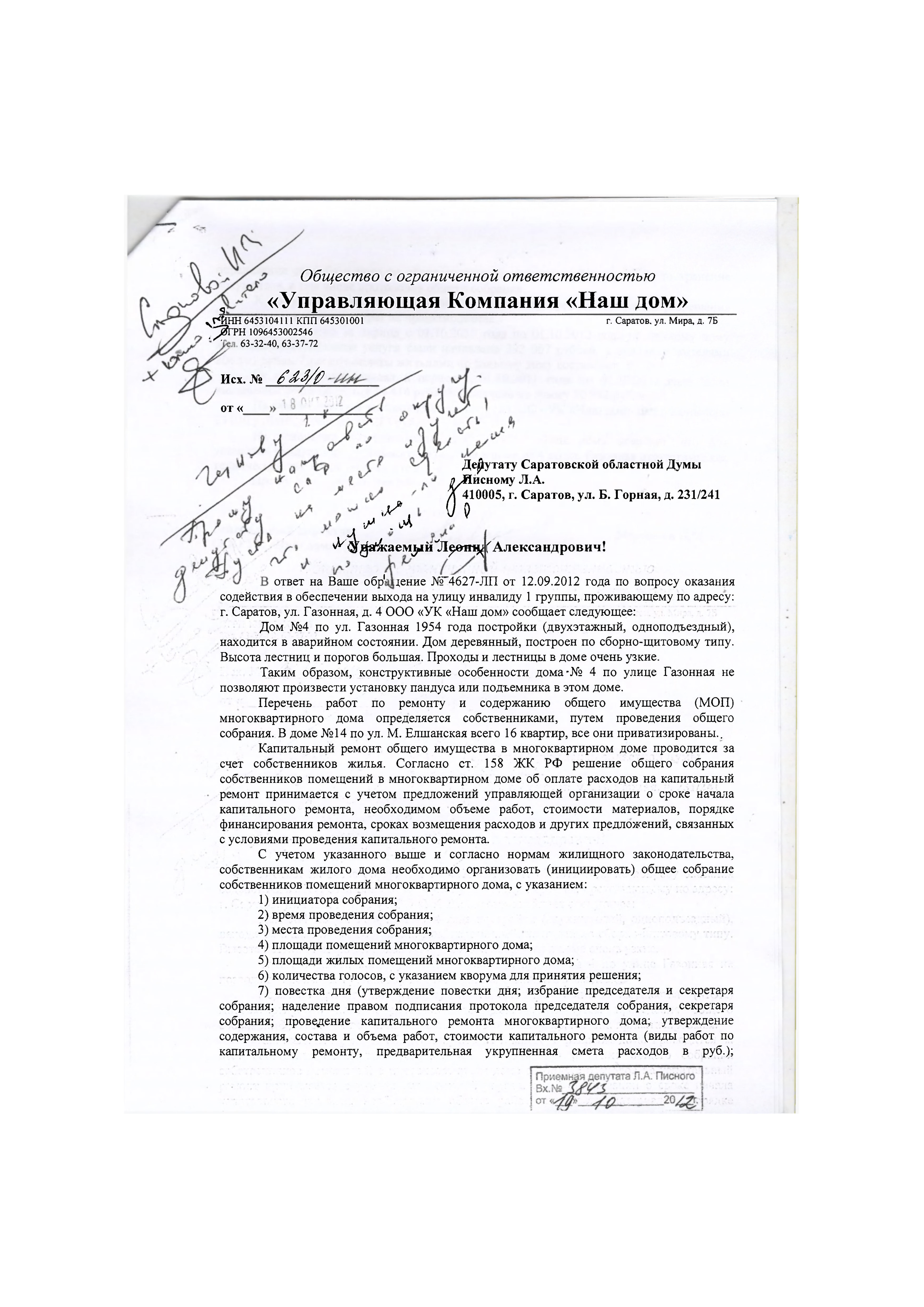 Здравствуйте Леонид Александрович! Пишет вам Прошкин Павел. Куда только не обращался я с данной проблемой, и Губернатору, и Президенту, и еще много куда писал, теперь решил написать вам, есть маленькая надежда что с вами мы сможем решить мою проблему. Проблема у меня такая, я инвалид 1-ой группы (колясочник) проживаю в бывшем общежитие(деревянное строение) на втором этаже с отдельным выходом (крутая лестница), так вот по этой лестнице здоровому человеку ходить не безопасно, а уж на коляске так вообще не реально, обратились в управляющею компанию (ТСЖ Наш Дом) с просьбой сделать мне доступ к улице, там мне ответили что нет технической возможности, тогда мы решили продать квартиру и приобрести жилье со свободным выходом, но оказалось что наша квартира почти ни чего не стоит, и за вырученные деньги мы ни чего не купим, решили сами сделать пандус, обратились в компанию по метало изделиям, там согласились но сумма оказалась для нашей семьи неподъемная. В итоге я как сидел на втором этаже так и сижу, а жить то хочется, мне всего 22 года, я еще молод и активен. Помогите мне решить мою проблему! Помогите мне стать еще активнее! Очень бы хотелось попасть к вам на прием.