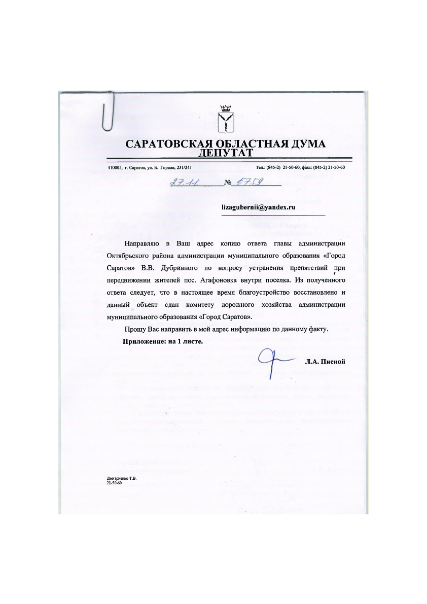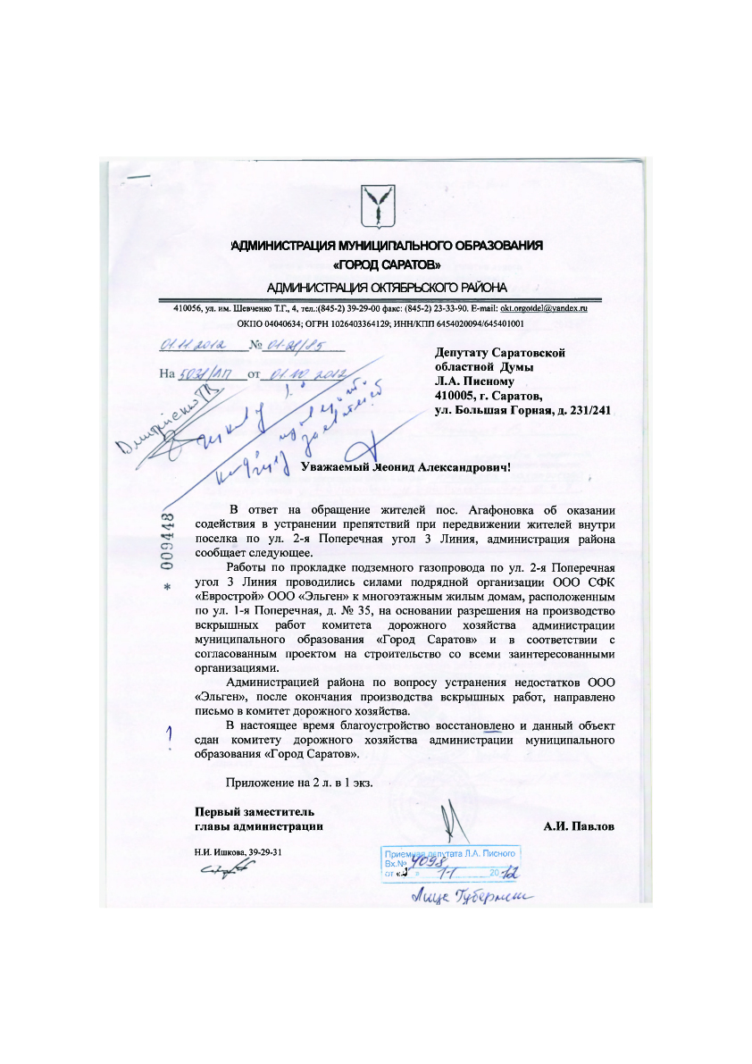 Уважаемый Леонид Александрович,во первых поздравляем Вас с днём строителя. А теперь неприятный вопрос: долго ли мы будем терпеть неудобства связанные с изуродованной дорогой на 2 поперечной угол 3 линии в Агафоновке??? Мы не можем ждать!!! пока Вы сдадите дома,к нам уже скорая не может проехать,сами жители постоянно проваливаются и застревают в песке. Если Вы не можете повлиять на эту фирму -вредителя ЭЛЬГЕН, то мы вынуждены будем обращаться в прокуратуру. Вопрос очень простой, по закону данная фирма обязана привести в порядок дорогу после вскрышных работ с применением щебня! неужели это такая проблема ЩЕБЕНЬ, мы же не требуем положить нам асфальт (ХОТЯ?) И ПОЧЕМУ МЫ ДОЛЖНЫ ЖДАТЬ??? ЧЕГО ТО И КОГО ТО? МЫ ЖЕ КАЖДЫЙ ДЕНЬ ЖИВЁМ ДОМА! ОЧЕНЬ ВАС ПРОСИМ ПРИМИТЕ МЕРЫ ЗАСТАВЬТЕ ЭТУ ФИРМУ ПРИВЕСТИ В ПОРЯДОК ДОРОГУ!