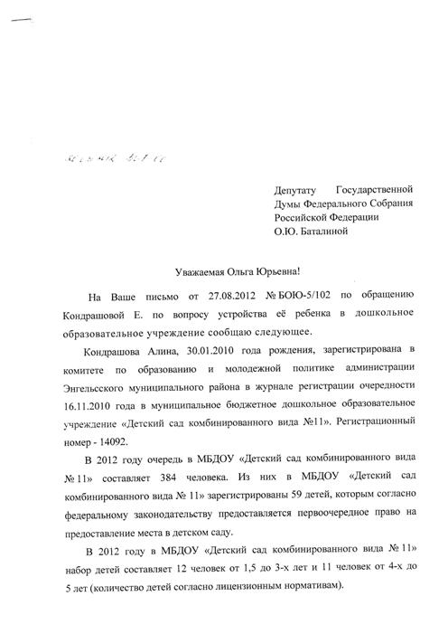 Уважаемая Ольга Юрьевна! Обращается к Вам мать-одиночка. Когда родилась моя девочка Алина – мои родители были очень рады. Думали, что будем воспитывать нашу девочку сами – знали, что с детскими садами очень сложно. Но родители, к сожалению, не молодеют. У мамы обнаружили онкологию, папа – инвалид 2 группы недавно его парализовало. Мне приходиться ухаживать за престарелыми и больными родителями. Обратилась к чиновникам – мне предложили сдать их в интернат или нанять сиделку. Обратилась к помошнику депутата помочь с детским садом для ребенка - она предложила мне сходить в церковь, поставить свечки и записала меня на прием к председателю комитета по образованию и молодежной политике г. Энгельса, где мне тоже предоставили «выбор» - определить ребенка в коммерческий детский сад или в детский приют на 3 месяца. Что же это за страна такая, где чиновники без зазрения совести предлагают сдать своих престарелых родителей и детей в приюты, вместо того, чтобы предоставить для ребенка место в детском саду? Сейчас мы с дочкой живем в двухкомнатной квартире с больными родителями. Вместо того, чтобы ребенок развивался со сверстниками, моей дочке приходиться смотреть на больных стариков. Прошу Вас помочь в предоставлении места в детском саду в г. Энгельсе. Моя дочь – Кондрашова Алина 30.01.2010 г.р. Мы стоим в очереди под номером 14 092 в д.с. № 11. Мой тел. 8-903-380-8755. С уважением и надеждой на помощь. Елена.