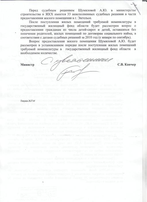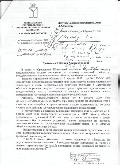 Уважаемая Анастасия. Я, конечно, не так хорошо, как в Саратове, владею вопросом предоставления жилья в Энгельсе. Но, поскольку постоянно нахожусь в Министерстве строительства и ЖКХ Саратовской области, могу сказать следующее: на сегодняшний день с учетом принятых нами совместно с министром строительства Канчером и зампредом Правительства Моисеевым решений за счет средств федерального бюджета в Энгельсе предполагается приобрести 80 жилых помещений для детей-сирот. Я обязательно запрошу в Министерстве строительства какой номер по предоставлении жилых помещений по Энгельсскому муниципальному образованию у Вас с учетом решения суда, принятого в 2010 году, так как, допустим, по городу Саратову на сегодняшний день идет предоставление жилых помещений тем, у кого судебные решения были вынесены уже в 3-м квартале 2011 года. Еще раз посмотрю за ходом комплекса процедур по приобретению жилых помещений в городе Энгельсе и дам Вам подробный ответ, но пока, предварительно, хотя понятно, что без конкретных документов невозможно точно рассчитать, мне все-таки кажется, что в этом году Ваш вопрос должен быть решен.