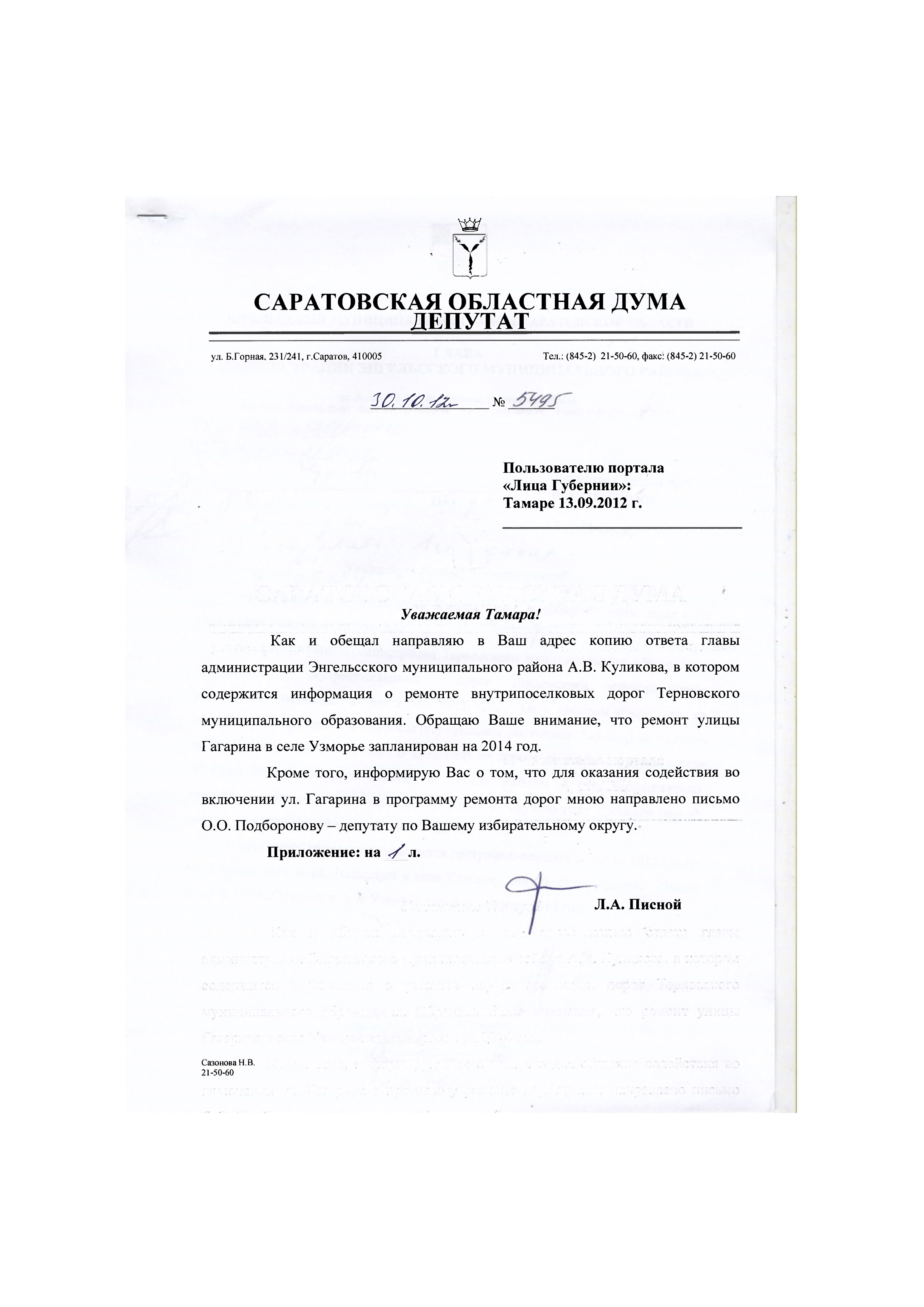 Уважаемая Жанара. Я обязательно, как обычно в этих ситуациях, запрошу администрацию Энгельсского района о планах по дальнейшему ремонту Вашей дороги, а после получения ответа опубликую его, и если нужна будет какая-то помощь от областной Думы, естественно, окажу.