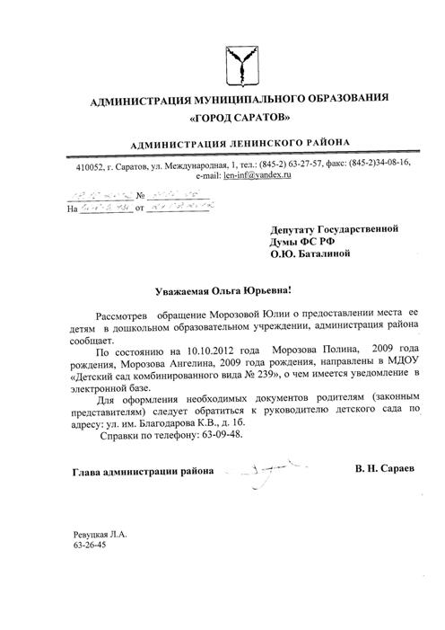 Уважаемая Юлия! Для выяснении Вашей ситуации мною направлен запрос в администрацию Ленинского района г. Саратова. После получения ответа Вы будете дополнительно проинформированы.
