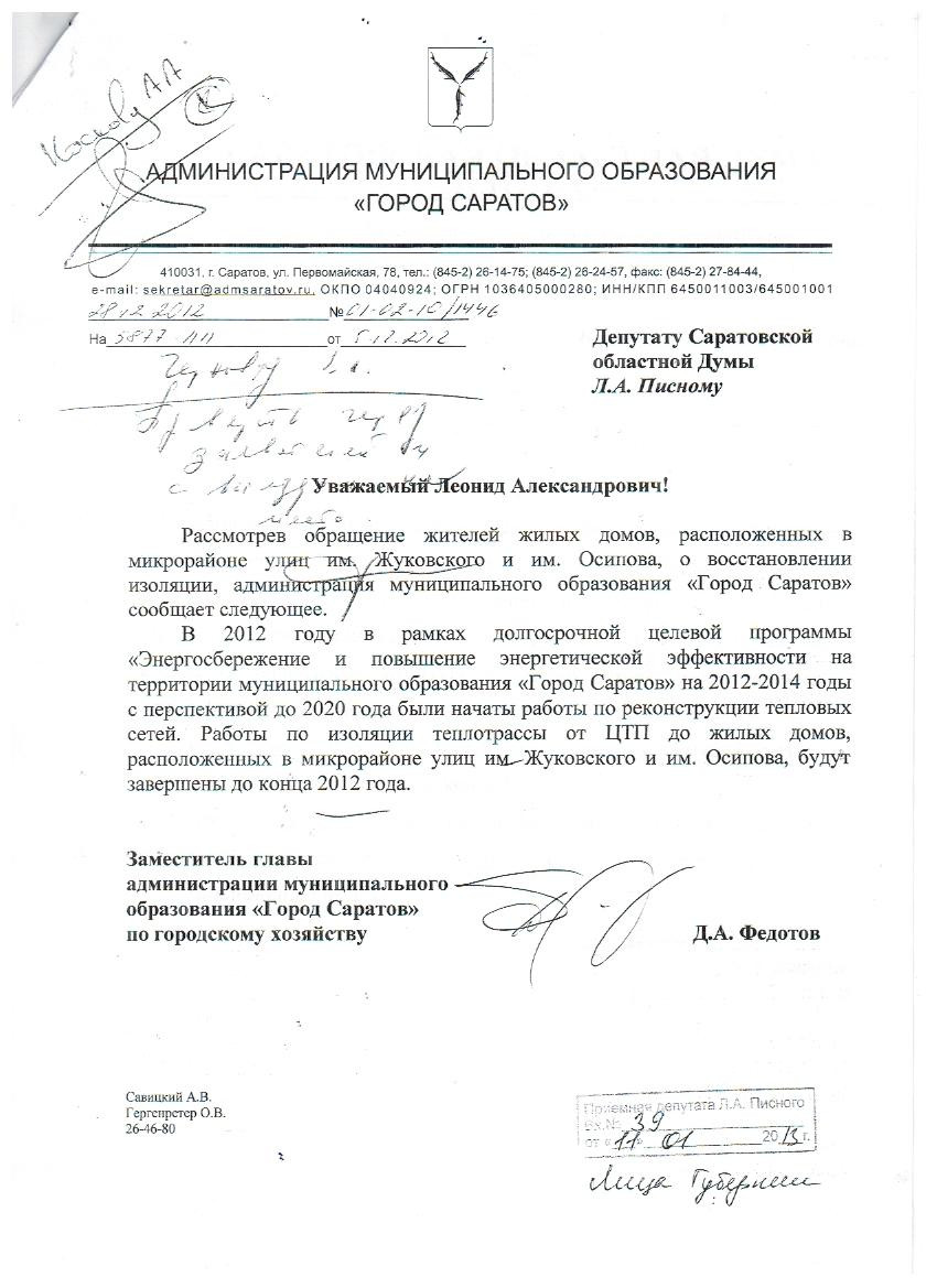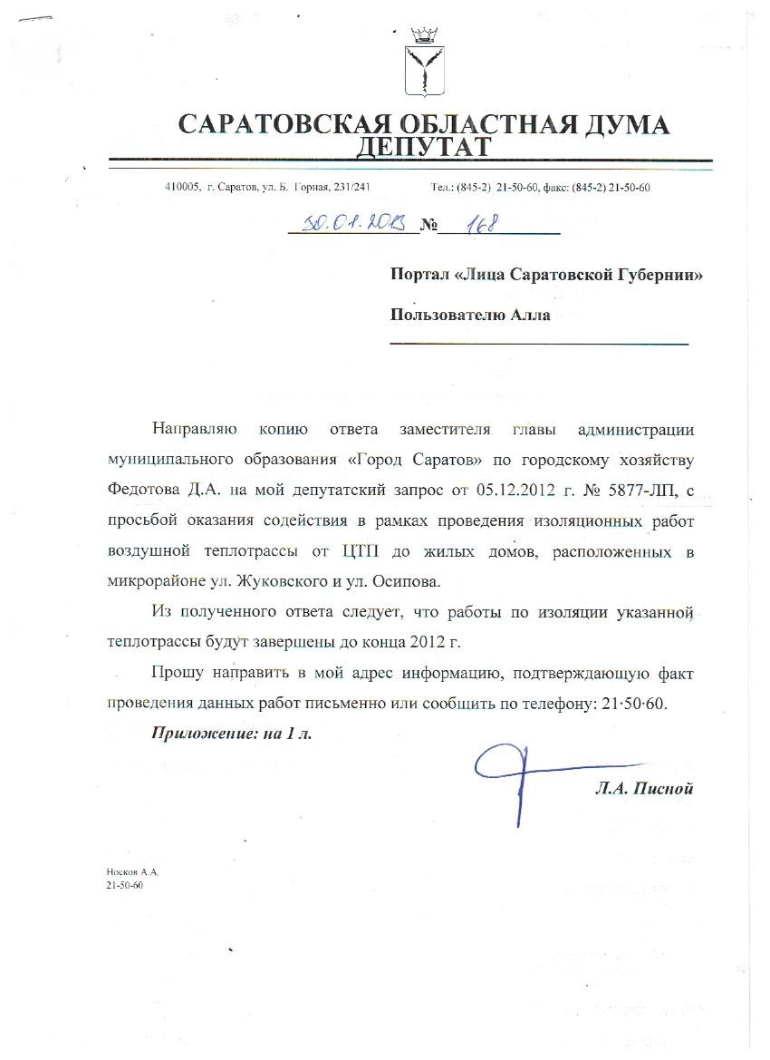 Уважаемая Алла, я продолжаю наблюдать за работой теплотрассы, построенной для теплоснабжения ваших домов, так как контролирую процесс укладки асфальта по тротуарам на Жуковского и у дома по улице Осипова 10/6. Думаю, что до Нового года нам удастся изыскать деньги на теплоизоляцию теплотрассы. Я держу вопрос на контроле. Что касается пуска отопления, то, по моим данным, вопроса, связанного с отоплением, нет. Если они сохранились на сегодняшний день, то просим повторно выйти уже на приёмную и без интернета, дать конкретный адрес квартиры, чтобы мы могли конкретно проработать с "Жилкомплексом".
