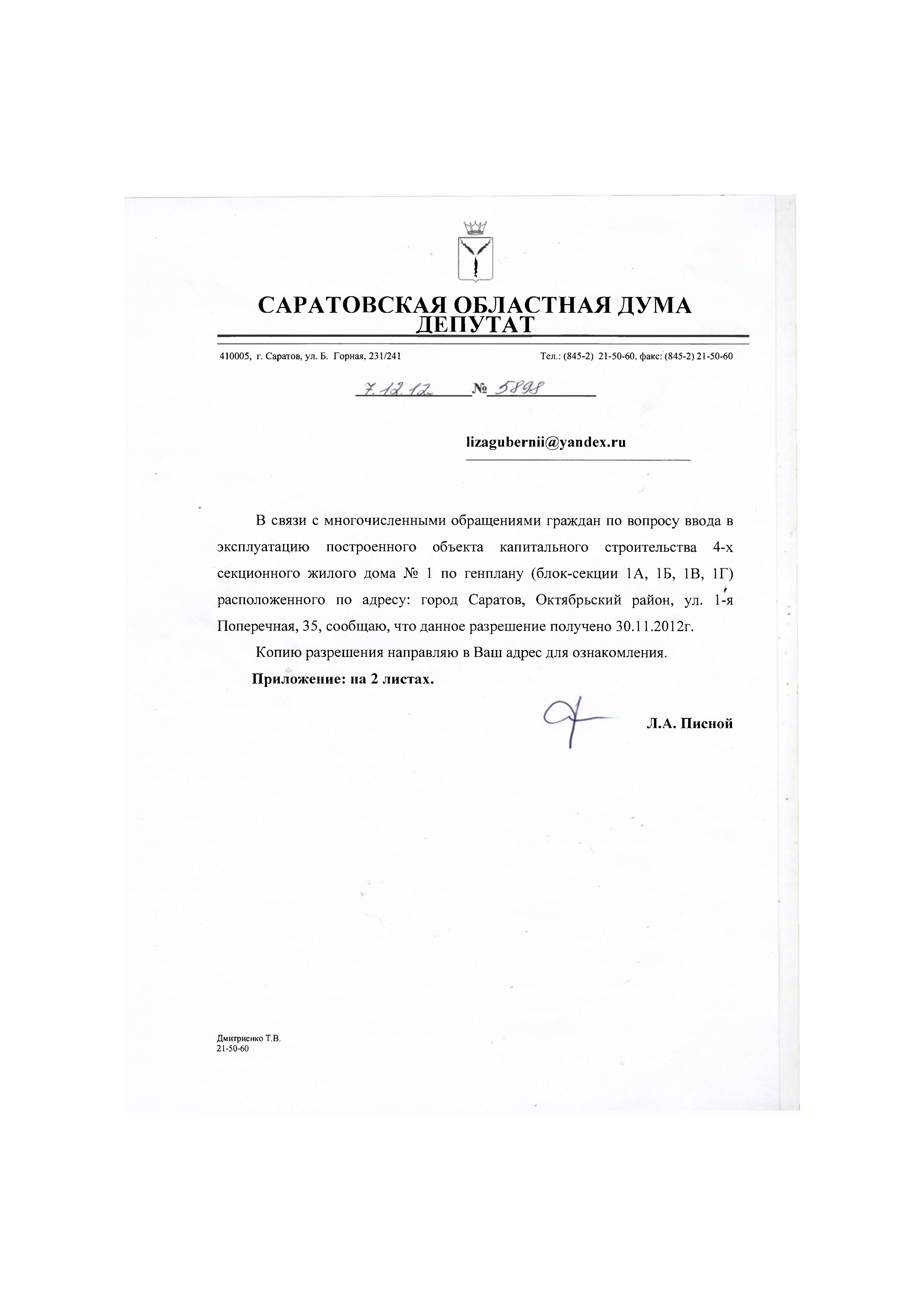 Уважаемая Татьяна, упрёки в наш адрес не совсем обоснованы, мы совместно с минстроем еженедельно предпринимаем всё, что возможно, для того, чтобы понудить застройщика ввести дом в эксплуатацию и запустить котельную, для того, чтобы осуществить заселение многоквартирного жилого дома по улице Поперечной. Очередной расчётный срок, который они обозначили - до 1 декабря. У них, действительно, остаётся последняя справка, это справка МЧС о безопасности работы котельной. Там есть определённые недоработки, которые никогда не имели отношения к "Саратовоблжилст