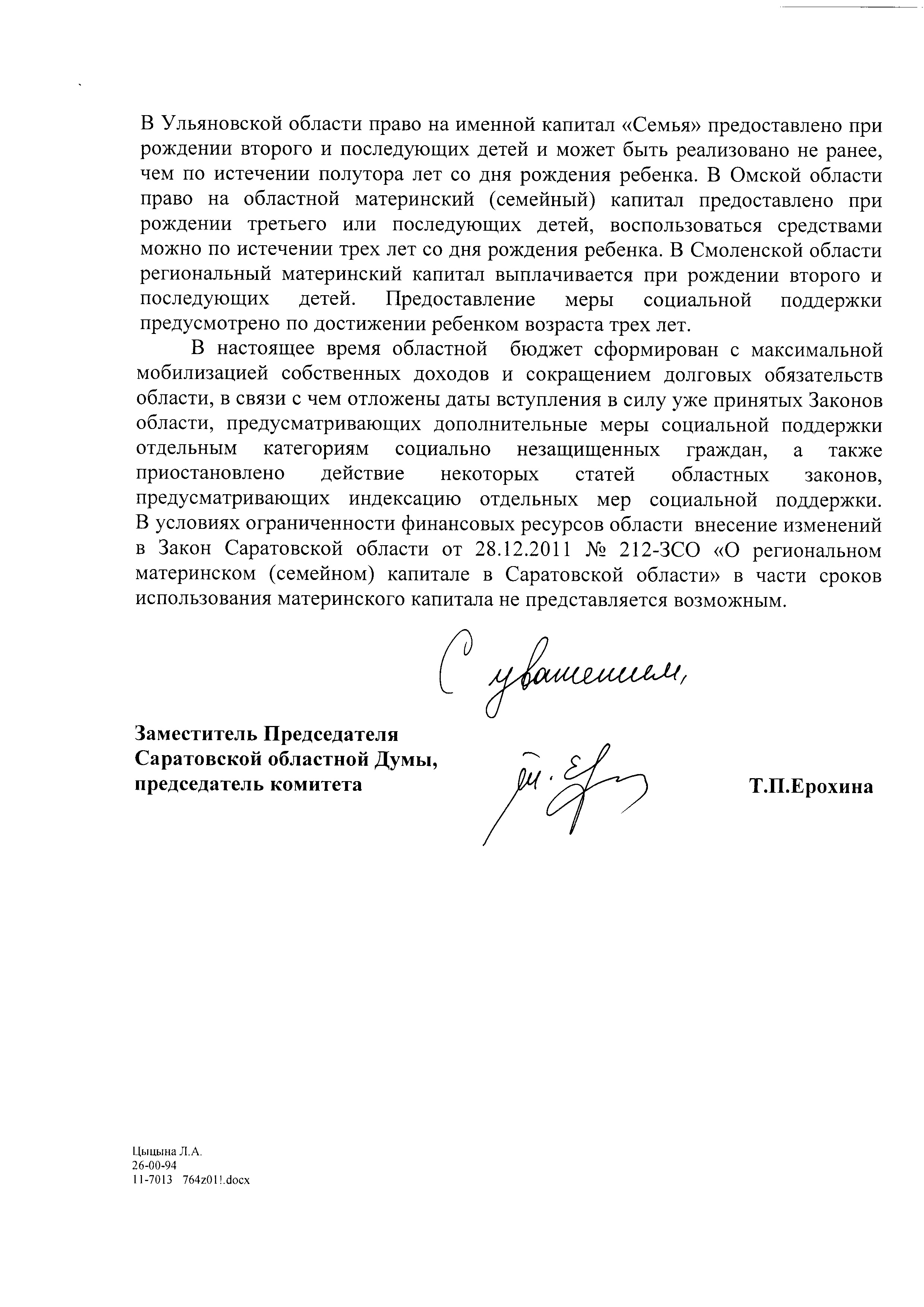 Уважаемая Ольга Юрьевна, в июле 2012г. я задавала вам вопрос о возможности внесения изменений в Областной закон Саратовской области о региональном материнском (семейном) капитале, в частности, о принятии поправки в закон в части срока получения материнского капитала с целью погашения кредита на улучшение жилищных условий с момента рождения ребенка, не дожидаясь 3-х летнего возраста (как в Федеральном Законе о материнском капитале). Вы мне ответили, что данное предложение взято для внимательного изучения депутатами Саратовской областной думы. Хотелось бы узнать, рассматривали ли депутаты данный вопрос и было ли принято решение? С Уважением, Надежда