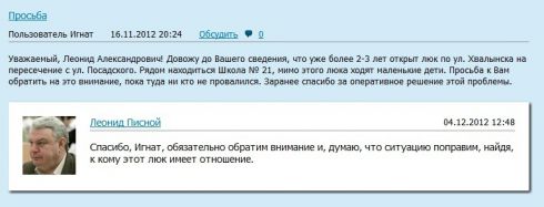 Уважаемый Леонид Александрович! 4.12.12 Вы обещали обратить внимание и поправить ситуацию, но люк до сих пор не закрыт.