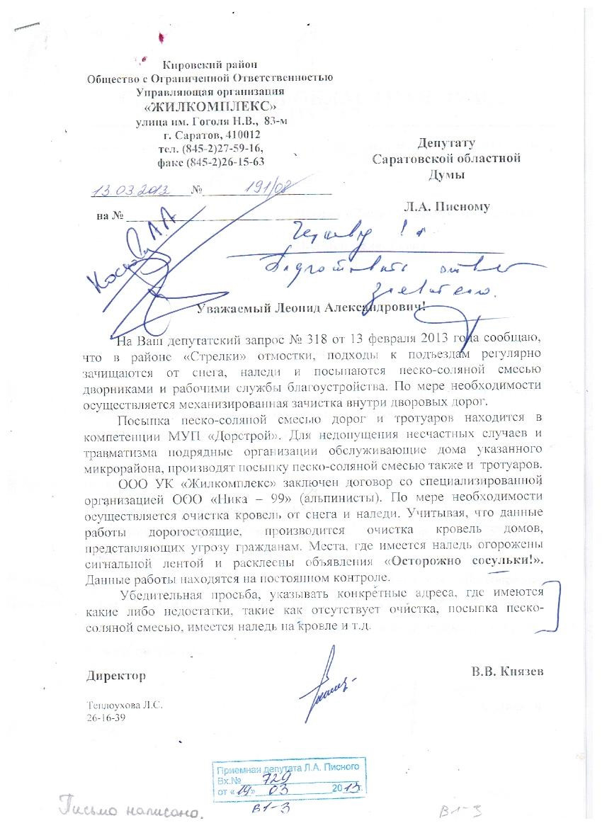 Спасибо, что сообщили об очередных безобразиях, я обязательно переговорю на жестких тонах с ООО «Жиломплекс» и направлю соответствующее письмо в прокуратуру Кировского района, чтобы они изучили ситуацию и имели представление об устранении нарушений жилищного законодательства и, тем более, которые могут привести к тяжелым последствиям.
