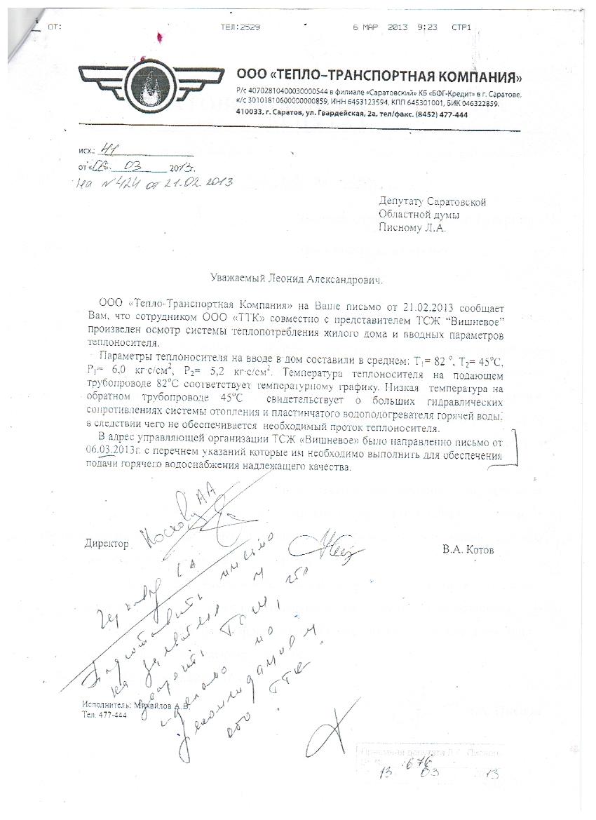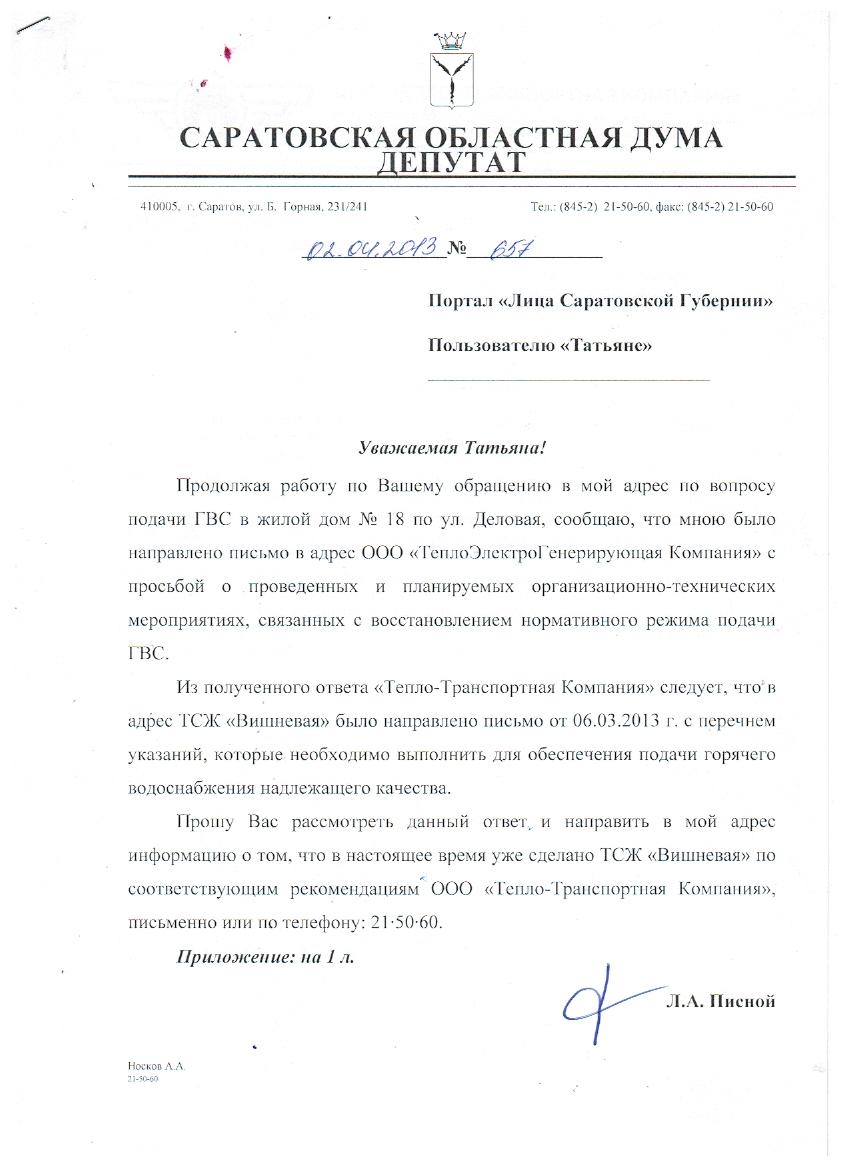 Уважаемый Леонид Александрович!!По поручению жильцов нашего дома №18 по ул.Деловая,ТСЖ"Вишневое" СТСЖ"Волга" 2 Дачная Ленинский район пишу Вам я.Кудрявцева Татьяна Ивановна,простая пенсионерка,кв70. сот.89372672141 Помогите решить проблему подачи горячей воды.В последнее время,а именно:ноябрь,декабрь 2012 г.,январь 2013 г. и по сей день ее нет.На наши обращения по "горячей линии"посылают в ТСЖ,а ТСЖ посылает в Эергосбыт и т.д.В доме проживают пожилые люди,все попростывали,ловят момент,чтобы как-нибудь искупаться.Просто безобразие.Ведь немалые деньги берут за ГВС! Еще нас интересует,что это за графа в платежке на общедомовые нужды по ГВС,ведь в подъездах у нас даже не метут,не говоря о помыве горячей водой стен и лестниц!!!Почему на ОДН ПО ВСЕМ ПЛАТЕЖАМ суммы превосходят индивидуальные платежи??? Также волнует вопрос платежей на кап.ремонт в многоквартирном доме.Буквально на днях видела Ваше выступление по телевидению,где Вы сказали,что этот платеж включат в расчетки.Так ведь наш дом с 2009 года платит по этой графе,а капремонт делали только по 185 ст.ФЗ РФ.Сделать ремонт в подъездах не можем добиться с 2005 года,уж,наверно,накопили за эти годы необходимую сумму.Состояние лицевого счета за 2011 год прислали по всем домам,входящим в наше ТСЖ "Вишневое".Каково состояние финансов по нашему дому понять невозможно!Что происходит???Все теряются в догадках. В общем и целом,надеемся на Вашу помощь.Хотя бы вразумите меня,как нам бороться с этой бездушной машиной дальше.Очень все мы ждем ответа,всем домом.
