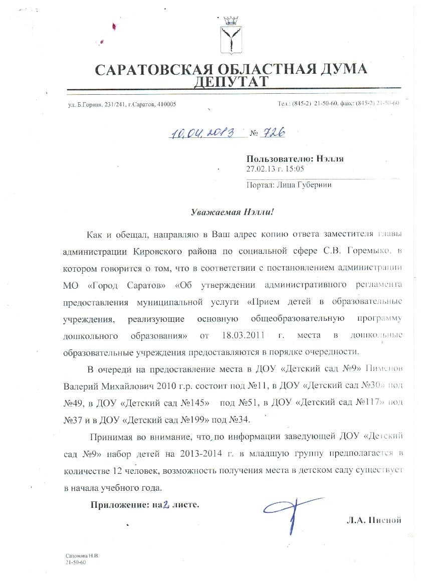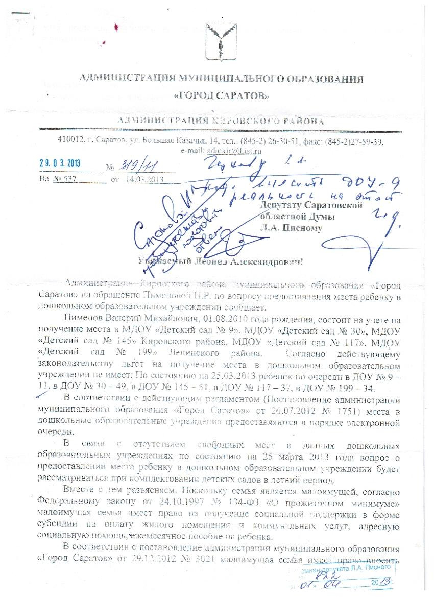 Здравствуйте уважаемый Леонид Александрович! Моему ребенку Пименову Валерию Михайловичу 01.08.2010 года рождения отказывают в предоставлении места в детский сад, из-за нехватки мест. Прошу вас помочь получить путевку в детский садик. Муж получает мало, очень хочется выйти на работу и улучшить материальное положение. Родители не могут сидеть с ребенком по состоянию здоровья и проживают далеко в области, а нанимать няню – нет средств. Пожалуйста, помогите нам в сложившейся ситуации. Мы стоим на очереди в Кировском районе, детский сад №30,по очереди 48.