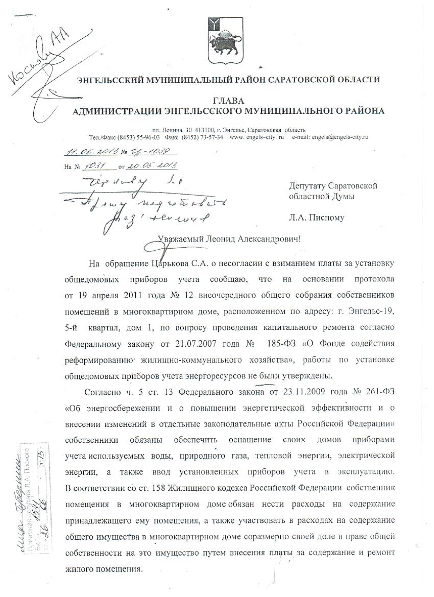 Уважаемый Леонид Александрович! Внашем Приволжском ПМО Энгельсского района началась компания по установке общедомовых счётчиков. Но в 2011 году наш дом попал под 185-ФЗ и на нашем доме был произведён частичныё капитальный ремонт. Согласно 185-ФЗ и изменений и дополнений к нему на 2011 год о капремонте во всех домах участвующих в этой программе должны быть установленны общедомовые счётчики.На этот счёт есть постановление Правительства Саратовской области за подписью губернатора Ипатова от 29 июня 2011 года № 328-П в котором наш дом включён в адрессную программу об установки в доме общедомовых счётчиков.Постановление 328-П вносит изменение в постановление Правительства Саратовской области от 26 февраля 2009 года №62-П. На сегодня нам устанавливают приборы учёта за полную сумму стоимости.У нас самый старый дом на посёлке и в нём живут большей частью пенсионеры у которых нет реально возможности платить полную сумму. У меня вопрос: - Когда будет исполнено Постановление Правительства Саратовской области? и будет ли исполнено вообще. - Хочется получить внятное и понятное разъяснение по установке приборов учёта. С уважением жители: Саратовская область, Энгельс-19 квартал-5 дом-1