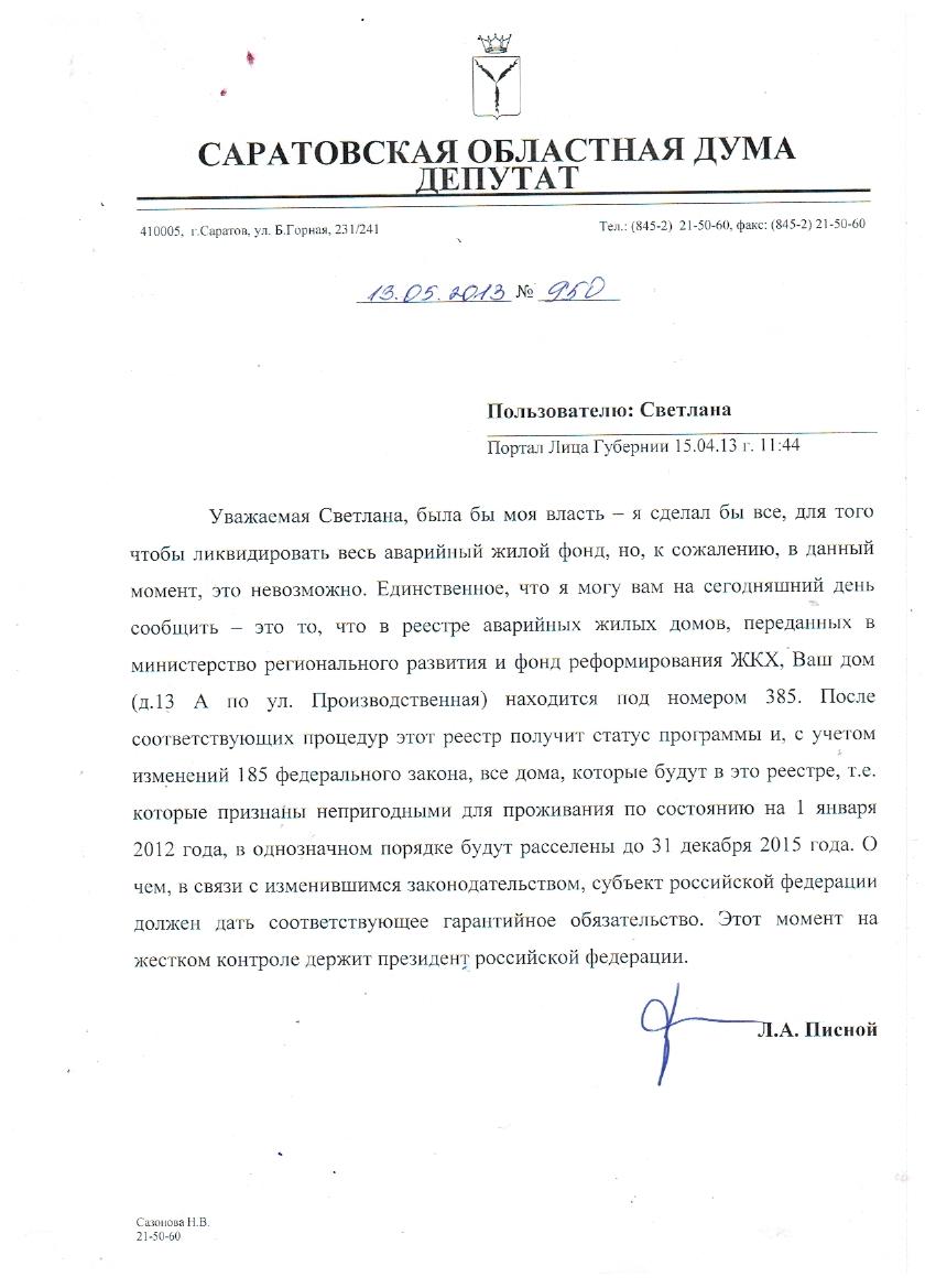 Уважаемый Леонид Александрович! Кроме Вас никто не может пояснить ситуацию. Я проживаю по адресу: ул. Производственная, дом 13-А. Были озвучены сроки до середины апреля, по решению вопроса о внесении нашего дома в реестр для отселения. Что-нибудь известно? Надеяться нам на отселение из ветхого жилья или в этом году нас в списки не включили?