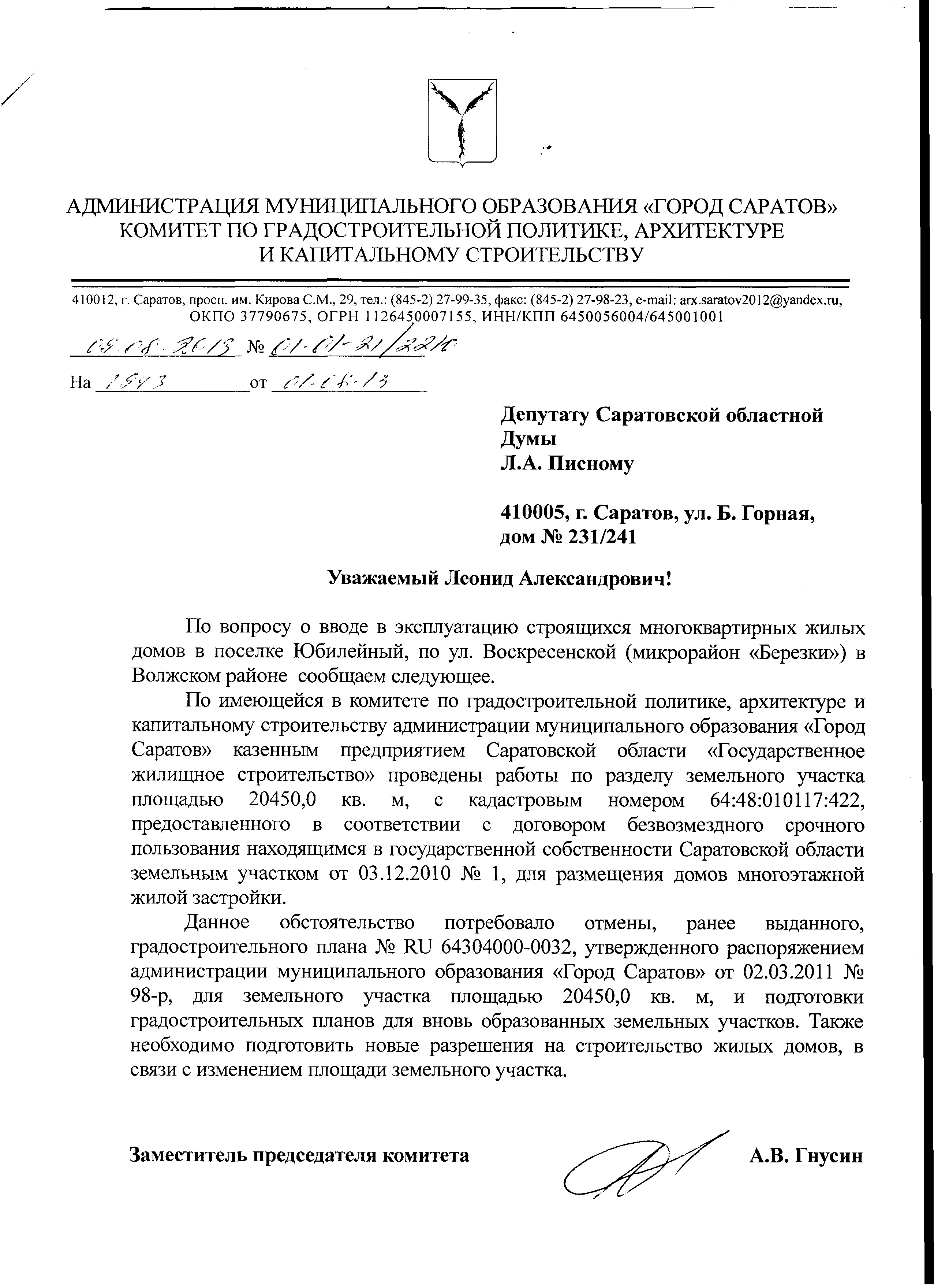 Что касается конкретно «Берёзок», там есть определённые «бумажные» моменты, которые требуют некоторого количества времени. Смысл их содержится в ответе комитета по градостроительству Саратова, я его публикую. Сейчас решением данного вопроса занимаются и специалисты КПСО, и специалисты «Саратовоболжилстроя» (публикую). Параллельно с этим, в целях решения вопроса о возможности пользования жилым помещением, мною дана команда — и она будет реализована в ближайшие две недели — о пуске всех коммунальных ресурсов (ну, может быть, за исключением горячей воды) в жилые дома и квартиры. Речь идёт о воде, электроэнергии, которая подключена, и подаче газа. Параллельно с этим, с управляющей компанией достигнуто соглашение, что они не будут препятствовать нахождению граждан в своих жилых помещениях, естественно, с соблюдением требований безопасности, и, естественно, с возмещением стоимости потраченных на коммунально-бытовые нужды ресурсов. Поэтому, если есть такая необходимость, надо написать заявление, которое я направлю в УК «Сфера», и Вы сможете своим жилым помещением пользоваться. С уважением, Писной.