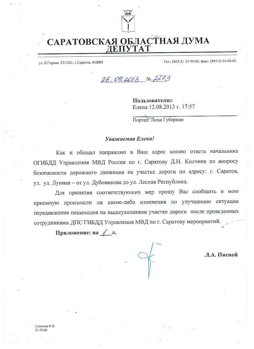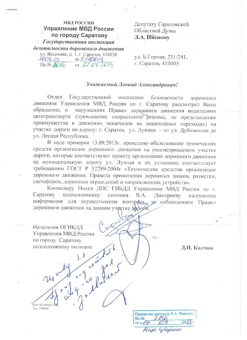 Уважаемая Елена, ну, я не думаю, что ГИБДД при принятии решения по светофорам исходило из воздушных замеров. Конечно, я ещё раз обращусь к ним и, если ответ будет отрицательным, попрошу, чтобы был контроль за знаком, за разметкой. Ну и в целях наведения порядка, обращусь к руководству ГУ МВД области с просьбой установить видеокамеру для фиксации безобразий водителей, если они не будут пропускать пешеходов.