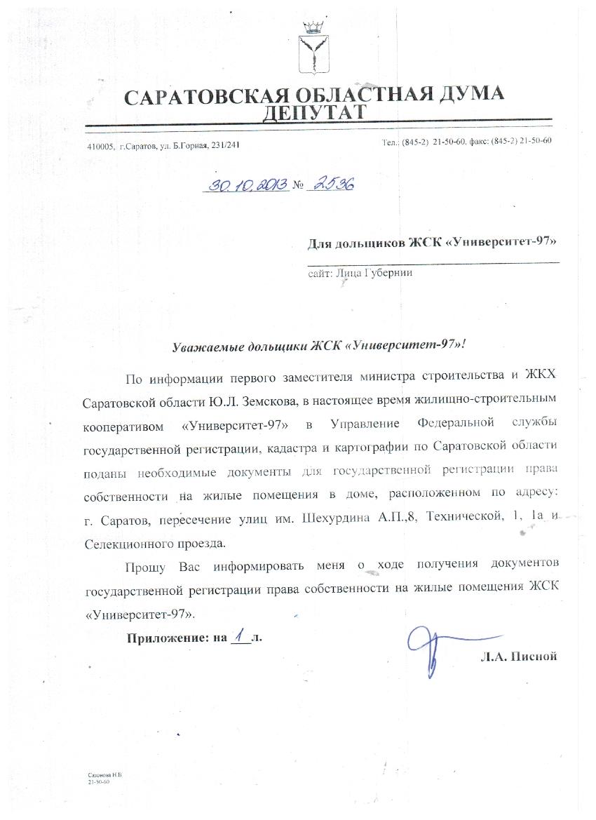 Уважаемая Наталья Алексеевна, я бы не хотел пустопорожних упрёков в свой адрес. Могу Вам сказать, что время, которое я потратил на оказание содействия ЖСК «Университет» к сдаче и теперь трачу на то, чтобы люди получили в собственность, меня вообще никто не обязывал, я не занимаюсь этим домом с 2005 года. Поэтому, сначала прочитайте ответ, который я получил из минстроя на своё очередное обращение по просьбе Ваших соседей. Если это не так, срочно мне сообщите. Потому что тогда уже затронуты будут не только Ваши права, но и, извините за красивое слово, может и моя честь. Потому что врать депутату нехорошо. Депутату, который лоббирует в рамках законных интересов избирателей, тем более, преступно.