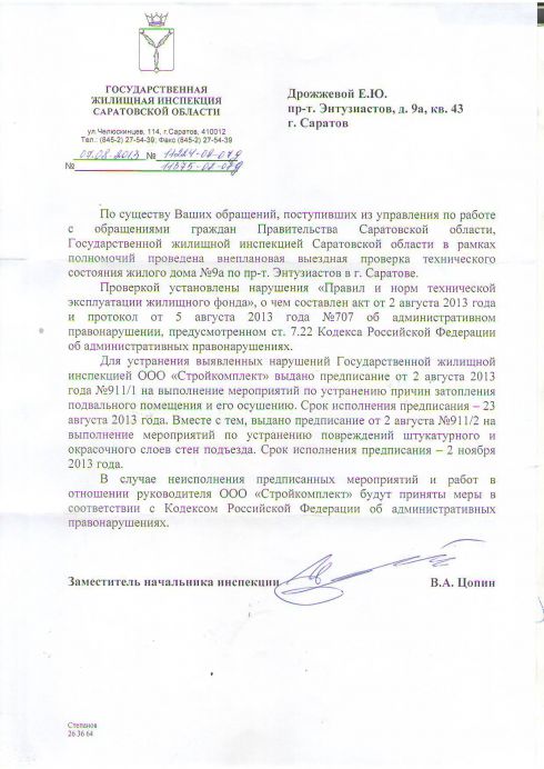 Добрый день! я проживаю по адресу г.Саратов ул проспект энтузиастов дом 9"А". В нашем доме на сегодняшний момент отсутствует отопление, подвальное помещение затоплено канализационными водами, состояние подъезда отвратительное. В августе месяце я писала письмо на сайт президента РФ, с просьбой решить проблемы по затоплению подвала ( в квартирах находится просто невыносимо: отвратительный запах, сырость и рой комаров которые летят из вентиляции), мне последовал ответ с сайта президента РФ,где было написано,что организации ООО" Стройкомплект" было выдано предписание произвести работы по осушению подвального помещения,и капитальному ремонту подъезда, но до сих пор никакие меры не были приняты...ответ то дали...а изменений не последовало.... Пожалуйста, проконтролируйте чтобы организация ООО" Стройкомплект" выполнила предписание выданное Государственной жилищной инспекцией, а именно приняла меры по устранению причин затопления и осушению подвального помещения( в предписании было,указано,что они должны были произвести работы до 23августа,но это НЕ БЫЛО сделано), так же провели мероприятия по устранению повреждений штукатурного и окрасочного слоев стен до 3 ноября 2013 года. Сегодня 24.10.2013 года, ремонт в подъезде сделан не был, подвал затоплен канализацией, и отопления так и нет. Как говорят местные сантехники, они не могут включить отопление из за затопленного подвала, потому что там необходимо все ремонтировать и откачивать воду,но этим никто не занимается.. Пожалуйста, проведите проверку по выполнению предписания и повлияйте на ООО " Стройкомплект",чтобы они выполнили свои обязательства! Р.S :Предписание с сайта президента могу предоставить Вам по первому требованию!
