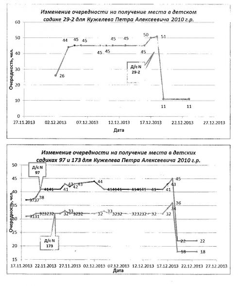 Добрый день, Марина Анатольевна! Очень хочется узнать, принимаете ли Вы участие в создании мест и заполнении групп в новом детсаду в Юбилейном? Я думаю Вы должны поучаствовать. Что твориться с очередью и как она "распухла" за период со 02.12.2013г по 18.12.13г!!! Нашего ребенка отодвинули на 25 человек в конец очереди! Я Вам прикладываю графики, которые мы делаем на протяжении нескольких лет (выкопировка за ноябрь)по нескольким садикам и терпеливо ждем очереди уже 3,5 года! Но теперь мы требуем, Вашего разбирательства в этой ситуации! Я, думаю, что меня поддержат и другие родители! И как понимать объяснения, которые нам дают, это дети из других детсадов (переводники), а как быть нам?