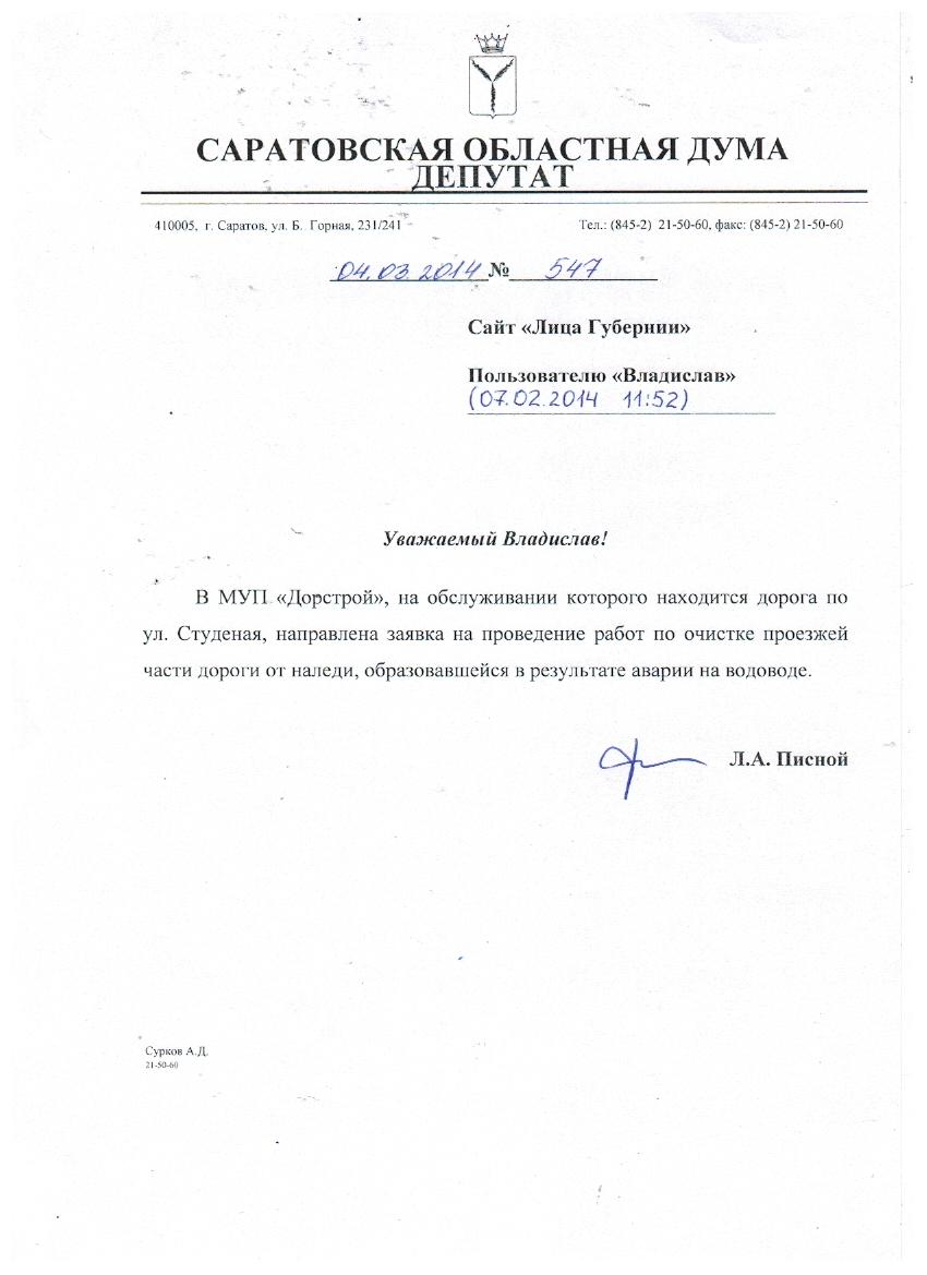 Уважаемый Владислав, всё, что в моих силах, это направить телефонограмму в Ленинскую администрацию. Думаю, что они учтут помощь депутата, хотя Вам, конечно, ещё следовало бы обратиться к депутату по Вашему округу, по-моему, у вас там депутат Андрей Беликов.