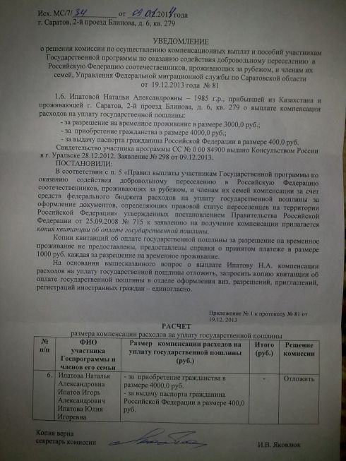 Добрый вечер, Виктор Алексеевич! Я участница государственной программы по оказанию содействия добровольному переселению в Российскую Федерацию. Прошла все этапы программы и приобрела гражданство РФ. 09.12.2013 года подала заявление за № 298 на выплату компенсации расходов на уплату государственной пошлины. Мне поступило уведомление Исх. МС/7/ 34 от 09.01.2014 года, приложение №1 к протоколу №81 от 19.12.2013 года о том, что к заявлению были приложены не копии квитанций об оплате государственной пошлины за разрешении временного проживания, а справки о принятом платеже из банка. Постановили запросить копии квитанций в отделе оформления виз, разрешений, приглашений, регистрации иностранных граждан. Выплаты компенсации за приобретение гражданства и выдачу паспорта РФ отложит, хотя по ним были приложены копии квитанций. Из уведомления я поняла, что комиссия по выплате компенсаций сделает запрос в отдел оформления виз, разрешений, приглашений, регистрации иностранных граждан и вынесет новое решение по моему заявлению, но вот прошло уже несколько месяцев и не какого дополнительного решения я не получала. Прошу Вас помочь в решении сложившейся ситуации, не хотелось, что бы мое заявление затерялось среди отложенных. Заранее спасибо!