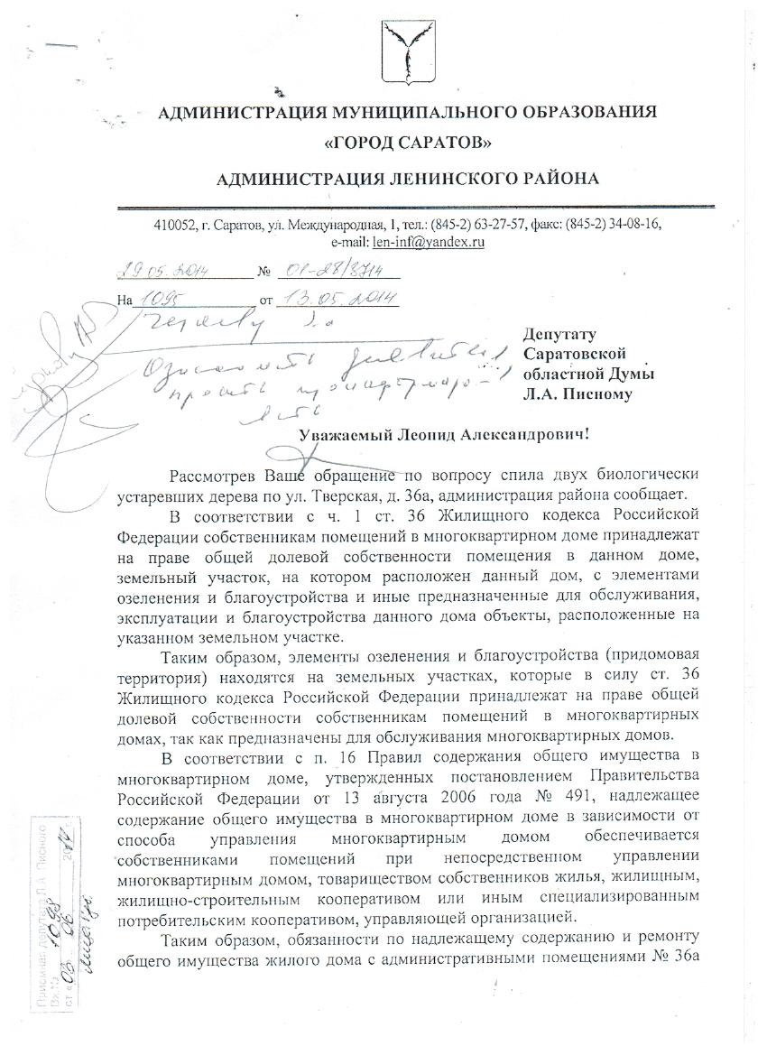 Уважаемый Леонид Александрович!Между домами по адресу Тверская 36Б и Тверская 36А находится детская площадка(вернее,что от нее осталось),на которой стоят два старых засохших огромных тополя,представляют собой опасность для детей,которые на ней гуляют.Обращение в Ленинскую администрацию результатов не принесло.Помогите,пожалуйста, их спилить и очень просим восстановить детскую площадку.Спасибо.