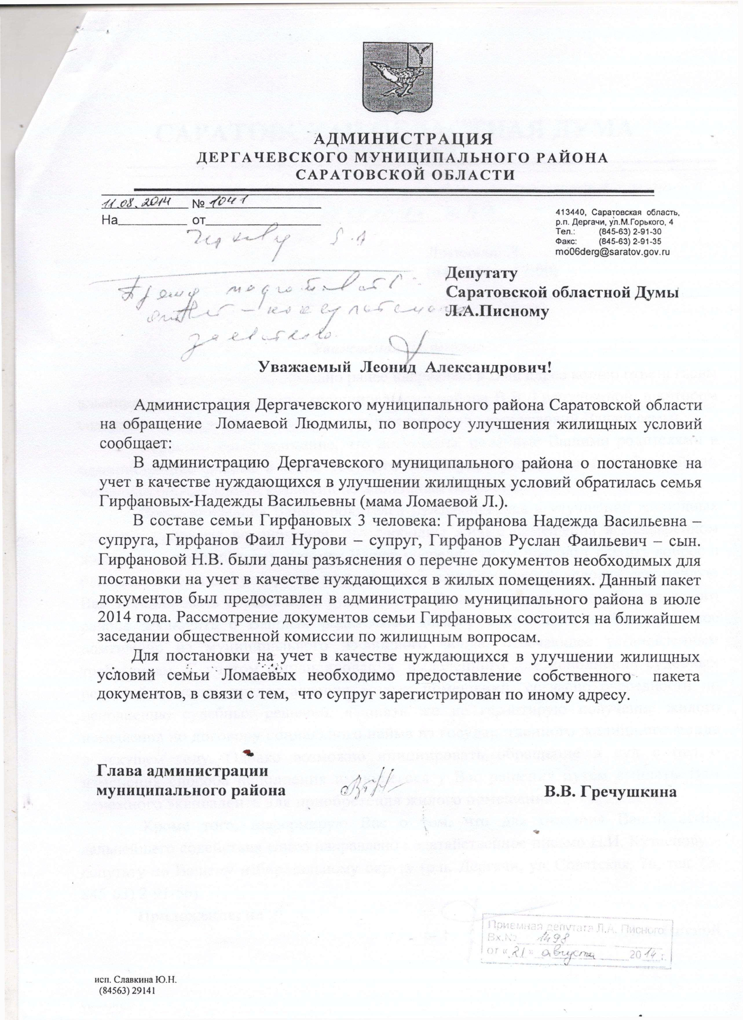 Здравствуйте Леонид Александрович!!Я живу в Дергачевской районе,(зовут меня Ломаева Людмила)с родителями, мужем и маленьким сыном,будучи в положении хотели встать на очередь по ветхому и аварийному жилью ,обратились в администрацию пришла комиссия и вынесли решение что часть жилья не пригодна для проживания ,так как дом саманный в момент наводнения вода была в доме ,отсюда запах сырости, плесень,грибок. Потолки провисли и дверной проем ниже стандарта.Когда нам дали решение комиссии в 2013 года ,мы сразу же решили встать на очередь,но нам сказали что встать на очередь мы можем только в следующем году т.к. все программы закрыты из за паводка на Дальнем Востоке. Затем мы обратились после Новогодних праздников оказалось что специалист по этим делам болеет сказать подождать потом нам дали все таки перечень документов,мать все собрала и отнесла в администрацию в итоге их опять не приняли сославшись что сейчас не до нас! Во общем протянули до июня ,когда мы пришли в очередной раз нам сказали что сейчас многие в отпусках и комиссию по нашему делу они не могут собрать. И нас так и не поставили на очередь,просто у меня маленький ребенок и я боюсь что к холодам начнется опять сырость и т.д. и ребенок заболеет.Чувствую своими силами мы ничего не добьемся. Прощу Вас помогите пожалуйста ! (Мой отец строитель мы бы хотели получить финансовую помощь от государства на строительство жилья )Заранее благодарю!