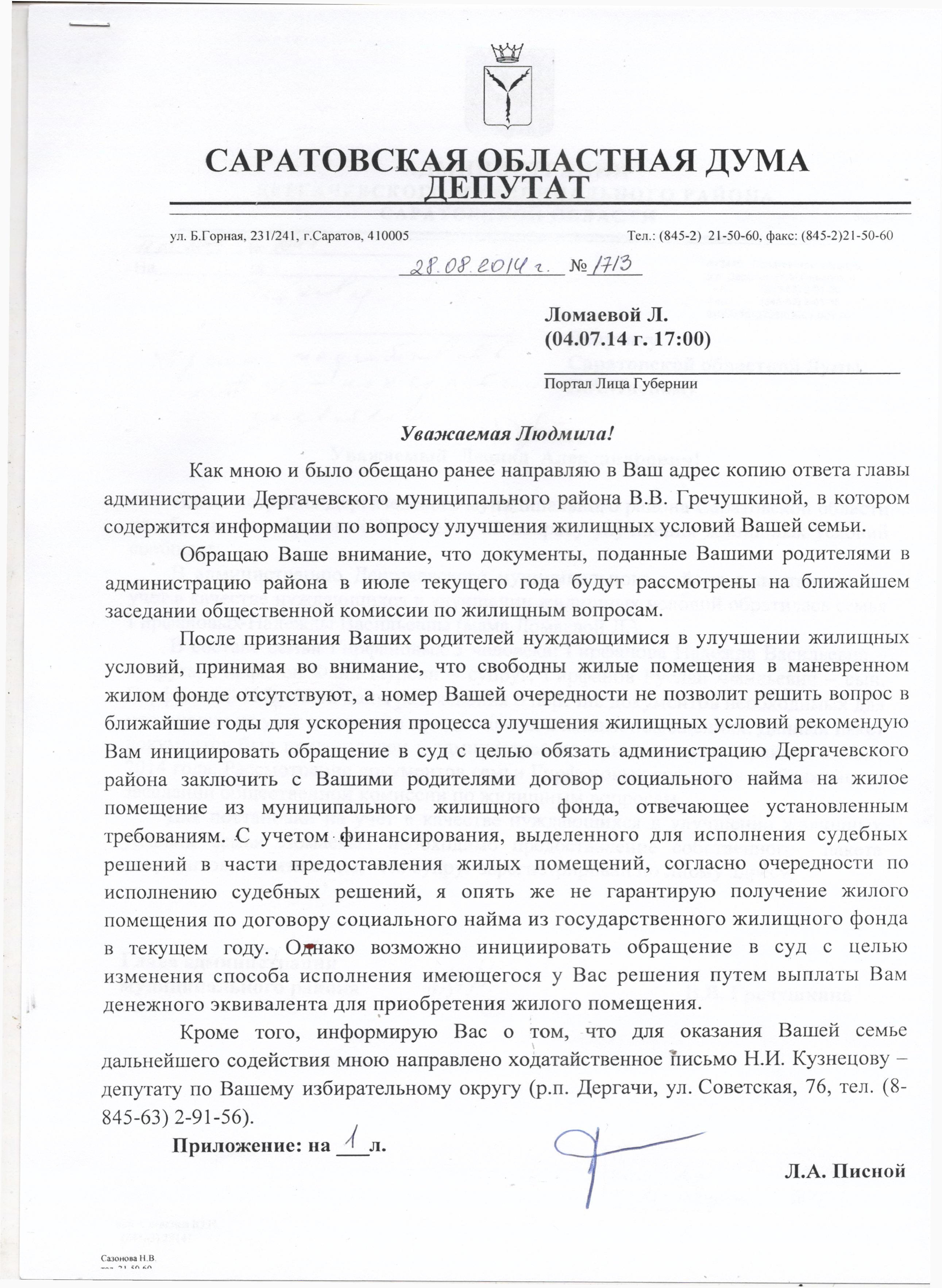 Уважаемая Людмила, я думаю, что Вам несколько, извините за некорректное слово, «пудрят мозги». Если ваш дом был признан непригодным для проживания до 1 января 2012 года, то на него Фонд содействия реформирования ЖКХ через областной бюджет выделяет ежегодно деньги на расселение этих домов. И все они должны быть полностью расселены, с предоставлением нового жилья, не позднее 2016 года. Если ваш дом признан после 1 января 2012 года, то Вы, на мой взгляд, должны на сегодняшний день не просить постановки в очередь, а обратиться с иском в суд о понуждении администрации Дергачёвского муниципального образования предоставить Вам жилую площадь. Если этого не сделают, этот иск легко заменить на способ исполнения — взыскание с муниципальной казны. Хотя я думаю, что администрация Дергачей исполнит решение суда. Если есть сложности с написанием, я думаю, что прокуратура района — им такие указания даны — Вам не откажет в помощи. Или поможет с написанием иска, или вообще выступит, при наличии определённых обстоятельств, в Вашу защиту. Я, конечно, со своей стороны напишу письмо в Дергачёвскую администрацию, но Дергачи достаточно далеко от Саратова. Они, конечно, попытаются учесть мою просьбу, но я не смогу их проконтролировать. Поэтому ещё я копию Вашего письма направлю ещё и вашему областному депутату. Но все эти письма подчас очень долго рассматриваются, и я думаю, что иск в суд будет гораздо более эффективен.