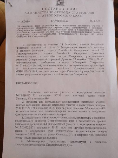 Уважаемая Президент РФ В.В. Путин! Под предлогом освоения Федеральных и краевых денег на строительство (перинатального центра) в Ставрополе незаконно переведен участок лесного фонда "Таманская лесная дача" - это участок городского леса №16, кадастровый номер 26:12:010522:171 якобы согласованный под строительство (перинатального центра) Подготовка к строительству (перинатального центра) в Ставрополе, как утверждает Правительство СК ведется по адресу ул.Семашко 3, ответ от 5 сентября 2014г № A26-11-864112491 в адрес Администрации Президента РФ (по моему обращению с проверкой). А фактически ведутся работы по подготовке к строительству в Таманском лесу. Посадку здания решено провести частично в городском лесу "Таманская лесная дача" участок леса №16., для этого главой Администрации города Ставрополя был незаконно переведен участок лесного фонда, городского лес: площадью 36131 кв.м, кадастровый номер 26:12:010522:171 под строительство (перинатального центра) Постановление от 11.06.2014 № 2036, что нарушило Лесной Кодекс РФ, Конституцию РФ, Земельный кодекс РФ, Градостроительный кодекс РФ. и. т.д. Зеленая комиссия от 14.07.2014 приняла решение о сносе зеленых насаждений под пятном застройки по адресу ул.Семашко 3/1. на ново присвоенном адресе на основании вышеуказанного постановления - а это участок городского леса №16 "Таманская лесная дача". Правительство РФ не знает что происходит реально в крае и городе! Помогите сохранить уникальный лес "Таманская лесная дача" уч. №16. Юлия