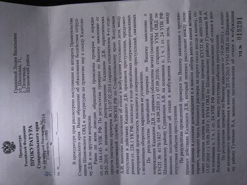 Уважаемый Владимир Александрович! Я очень надеюсь, что Вы лично получите мое обращение. Я проработала более 40 лет учителем, чтобы на старости лет бить ноги и обращаться за помощью годами за то, что шайка высокопоставленных: сотрудники наркоконтроля, Шпаковский РОВД, депутат Чурсинов – Герой труда, почетный гражданин района с купленными образованиями (криминальный авторитет) занимались наркобизнесом, а под ними отморозки, руками которых (Кадатского, у которого была перевалочная база наркотиков и других отморозков) меня гнобили и прессовали с 2006 года, выгоняли из собственного дома, который превратили в сарай. Кровлю просверлили, на доме сняли все, что можно снять, сняли и вынесли с чердака всё, что можно. Проникли в дом, вынесли из дома имущество, в доме ломали, сверлили. (Приложение 1, стр. 3-8 ) По какому праву сотрудница прокуратуры Ротко унижает мое человеческое достоинство, сидя в кабинете, отписываясь, опираясь на отписки Шпаковского РОВД, крышующих наркотики. (Приложение 2, стр. 9-11) Ничего невозможно добиться ни по линии прокуратуры, ни по линии МВД, ни по линии следственного комитета (Приложение 3, стр. 12-14 Мне пообещали справки различного рода, закрыть меня, а те, кто надо мной издевались, даже законотворцы. Наш участковый Суражин не раскрывал преступления, а организовывал их и крышевал. Дважды подводили под несчастный случай. (Приложение 1) Отморозок Кадатский в неадекватном состоянии сказал дословно: «Тебя давно должны были убить. Я не знаю, почему тебя до сих пор не убили?» Получается, что у нас начинают разбираться только, когда массовые беспорядки и убивают человека??? Я не живу, я существую в 37 году. За что? Я хочу, чтобы мне хоть кто-нибудь ответил, опираясь на Закон, который нарушают сами люди, которые обязаны стоять на страже Закона. На моих глазах протекали эти преступления годами, а я осталась крайняя, что понятно из контекста Ротко. Деньги и связи делают всё. У Чурсинова и того, и другого много. А мне где теперь жить? Труд всей моей жизни уничтожен. Почему за это никто не ответил? А гнобят, прессуют, издеваются над человеком, который не имеет никакого отношения к их преступлениям, а всего лишь свидетель. Прошу много лет создать независимую комиссию, выехать на место, чтобы люди убедились, что я не лгунья, как меня представляют сотрудники правоохранительных органов, в том числе – Ротко. Я хочу жить в правовом государстве, чувствовать себя человеком. Не моя вина, что существует социальная несправедливость.