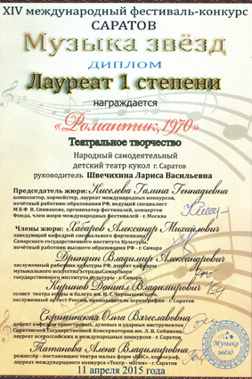 Коллектив муниципального учреждения культуры «Городской клуб детского творчества «Романтик» выражает благодарность депутату Саратовской областной Думы Андрею Павловичу Беликову за помощь в предоставлении транспорта 11.04.2015г. по перевозке декорации и реквизита в МУДО «Саратовский Городской Дворец Творчества Юных» (Театральная площадь,13), где юные артисты нашего учреждения приняли участие в XIV Международном фестивале-конкурсе «Музыка звёзд», заняв почётное I место. Надеемся на дальнейшее сотрудничество! С уважением, Директор А.С. Евдокимова