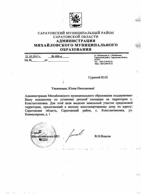 Уважаемый Валерий Васильевич!Я, Гурина Юлия Николаевна, как представитель жителей села Константиновка Саратовской области, обращаюсь к Вам с просьбой о помощи в установке детской площадки на территории села. В настоящее время в селе Константиновка проживает 45 детей дошкольного и школьного возраста. Однако, на территории села нет специально оборудованного места для гуляния детей. Дети вынуждены играть на проезжей части, что создает опасность их жизни и здоровью. Мы обращались за помощью к главе администрации Михайловского муниципального образования Власову В.Н., который предоставил земельный участок под строительсво детской площадки. Сейчас стоит вопрос финансирования данного проекта. Администрация президента направила наше обращение в правительство Саратовской области. Но,к сожалению, ответа от правительства так и не поступило. Очень надеемся на Ваше понимание и помощь.В заключении хочется процитировать президента РФ: "Сельские территории обладают мощным экономическим, демографическим, природным потенциалом. Наша задача - эффективно его использовать..." С уважением, Гурина Юлия Николаевна.