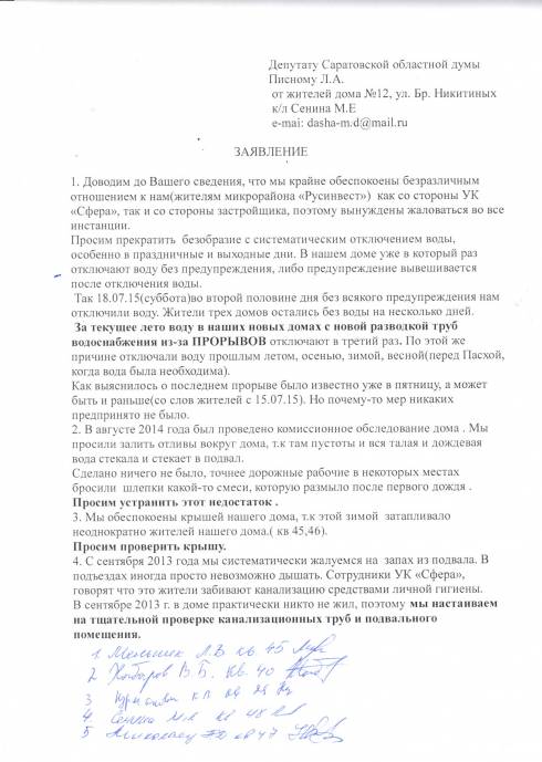 Леонид Александрович, добрый вечер! Отправляю Вам заявление от жителей нашего дома. Хочу добавить , что жители нашего микрорайона настроены решительно и это безобразие терпеть больше не будут. Нам надоело жаловаться и выпрашивать, чтобы нам исправили те или иные недочеты. То окна свистят и гудят, то крыша течет, то стены трещат, вода течет и.т.д СКОЛЬКО МОЖНО? Нам надоело ходить в поисках воды, когда ее отключают на несколько дней. НАДОЕЛО. Давайте как-то исправлять свои ошибки. У нас такое хорошее место. А многие уже хотят продавать свои квартиры из-за такого отношения УК "Сфера" , застройщика и качества постройки.