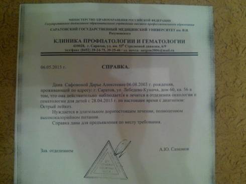 Здравствуйте. Вы бы могли помочь ребенку? Она больна лейкозом, у нее нет родителей.Она просто скоро умрет. Я понимаю, что вы очень занятой человек, у Вас очень много дел. Но могли бы вы выделить хоть 20 минут, чтобы заехать к больным детям и помочь им. Девочку зовут Дарья Сафонова лежит она в клинике гематологии и профпатологии. Если Вам не жалко и не трудно выделить хотя бы 10-20 тысяч на лечение и пропитание, то помогите, пожалуйста. С уважением, Екатерина Кутько.