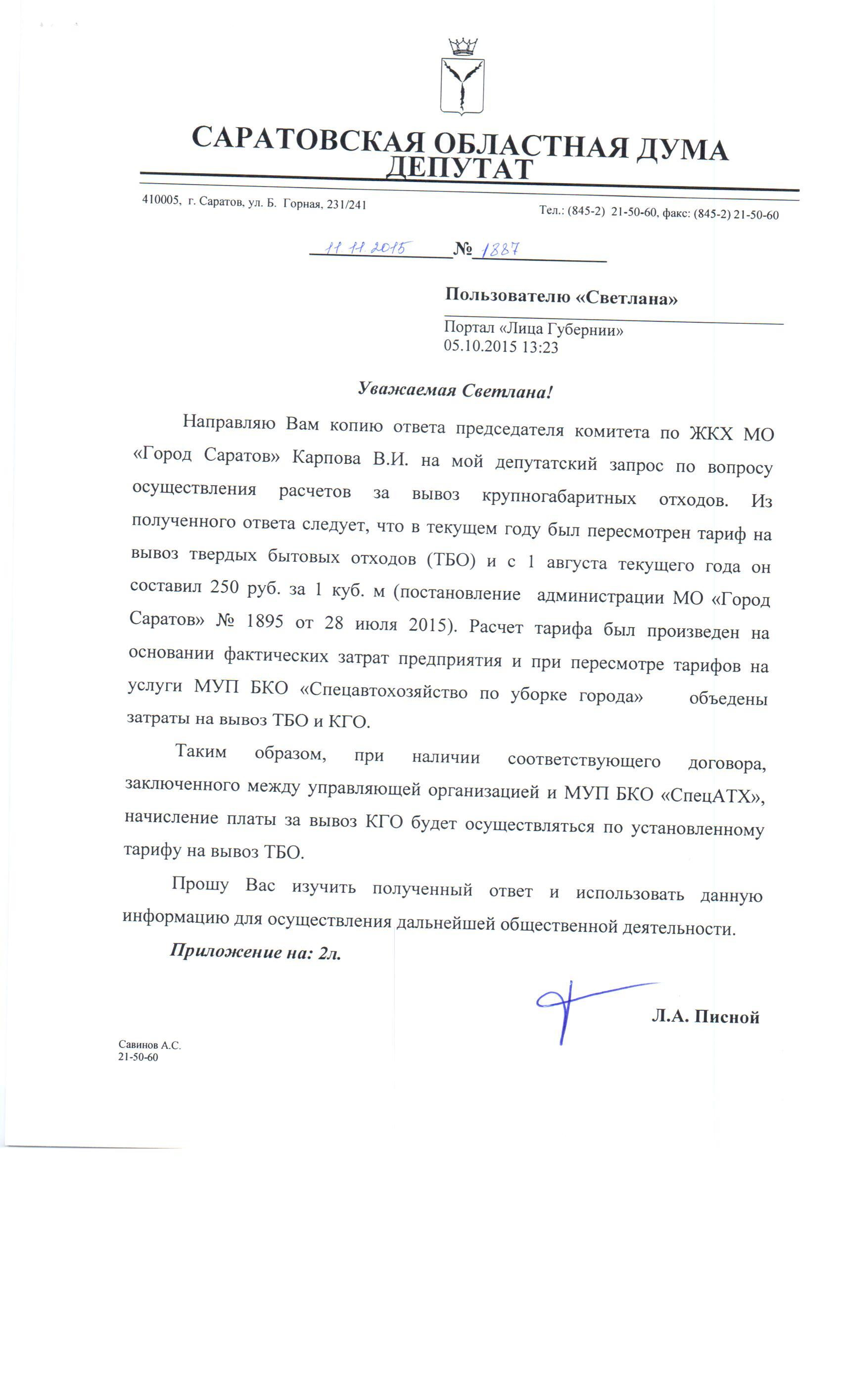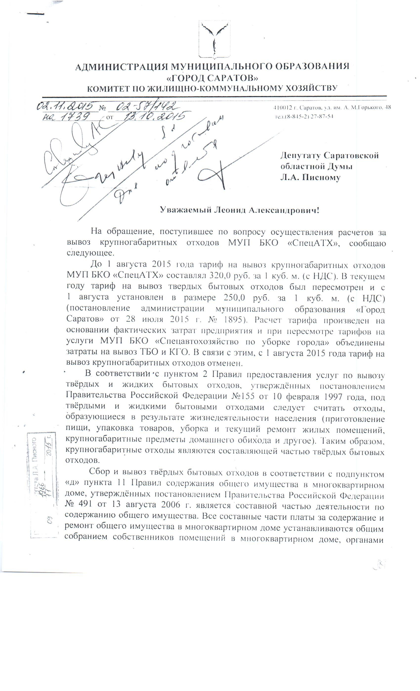 Леонид Александрович, разъясните, пожалуйста, чем обосновано повышение тарифа для населения и УК на услуги МУП "СпецАТХ" по вывозу твёрдых бытовых отходов со 118,65 руб. до 211,86 руб. за 1 куб.м, т.е. на 78,55%? Решением от 28 июля 2015 года № 1895 г-н Буренин исключил пункт 3 приложения к постановлению администрации муниципального образования «Город Саратов» от 29 декабря 2014 года № 4298 «О тарифах на услуги МУП БКО "Спецавтохозяйство по уборке города", устанавливавший тариф на вывоз крупногабаритных отходов. Следует ли понимать, что теперь вывоз КГО будет производиться МУП "СпецАТХ" без предварительных заявок от жителей, УК и ТСЖ, без дополнительных затрат, согласований и в "рамках" нового повышенного тарифа?