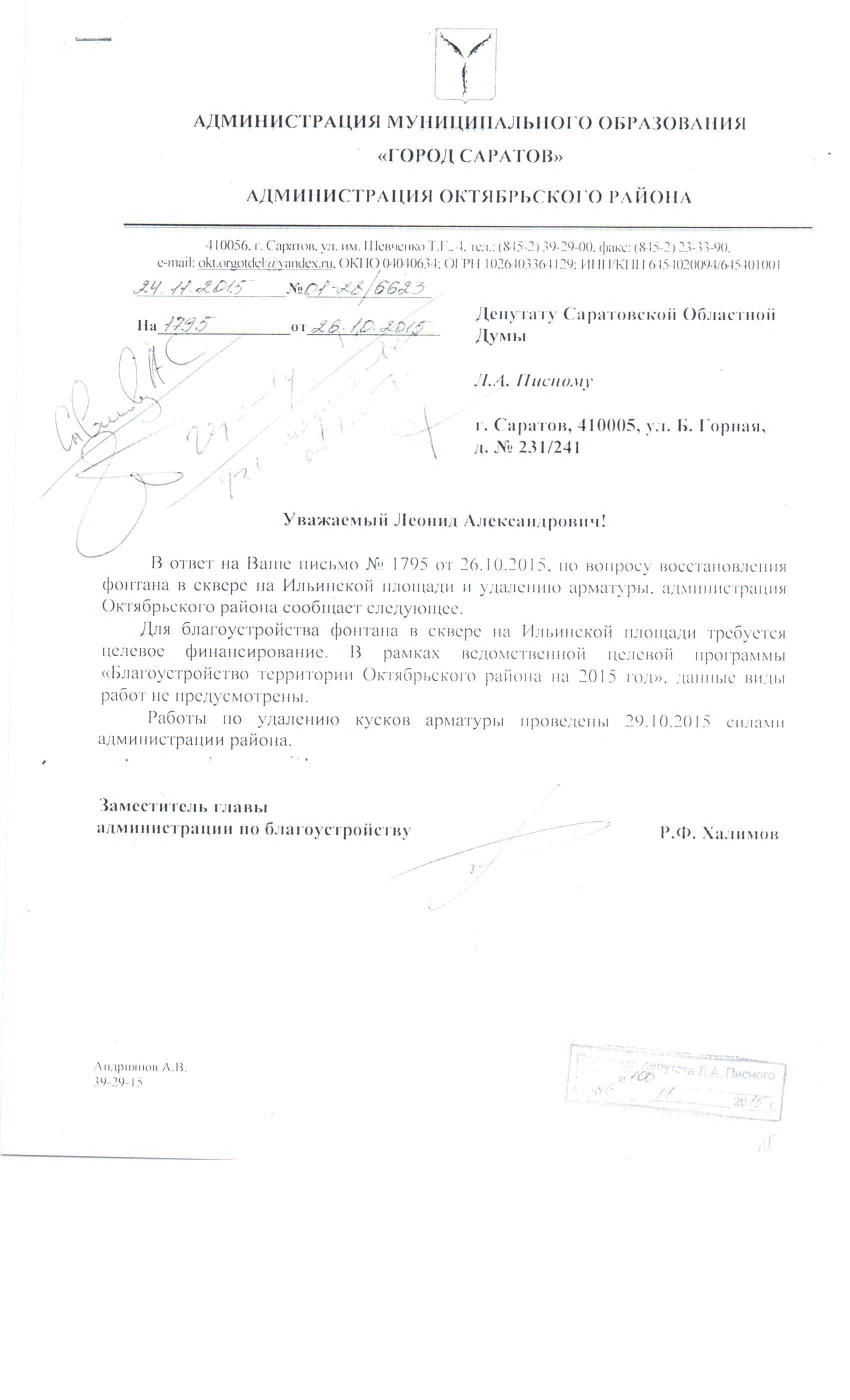 Уважаемый Леонид Александрович!У сам к вам просьба.Окола 62 лицея стоит разрушенный фонтан это находится на Ильинской площади.Конечно восстановить его на это надо деньги.Но мы просим Вас помочь чтобы срезали арматуру которая из него торчит. Дети после школы выбегают и сразу лезут на этот фонтан .ЭТО ОЧЕНЬ ОПАСНО!