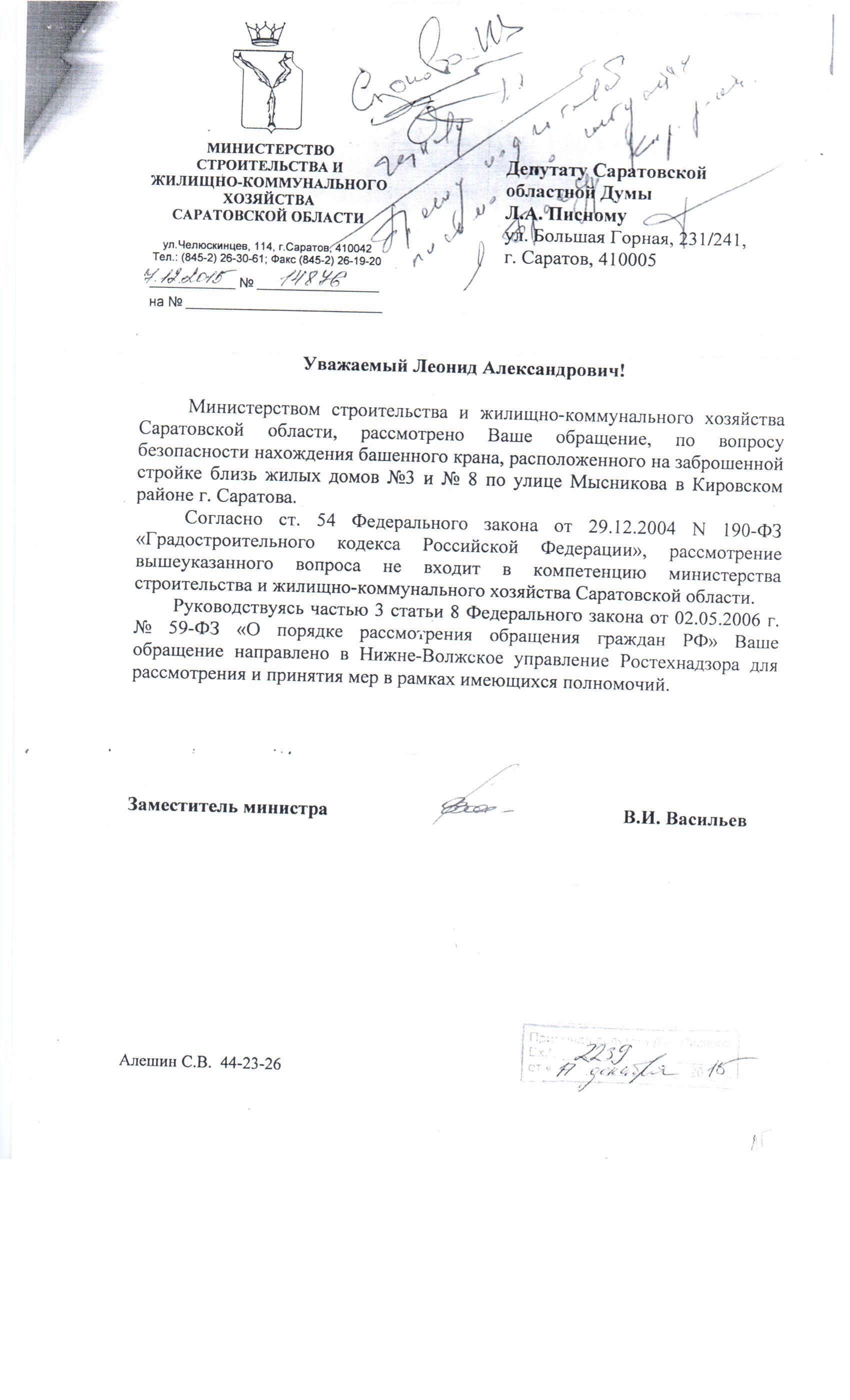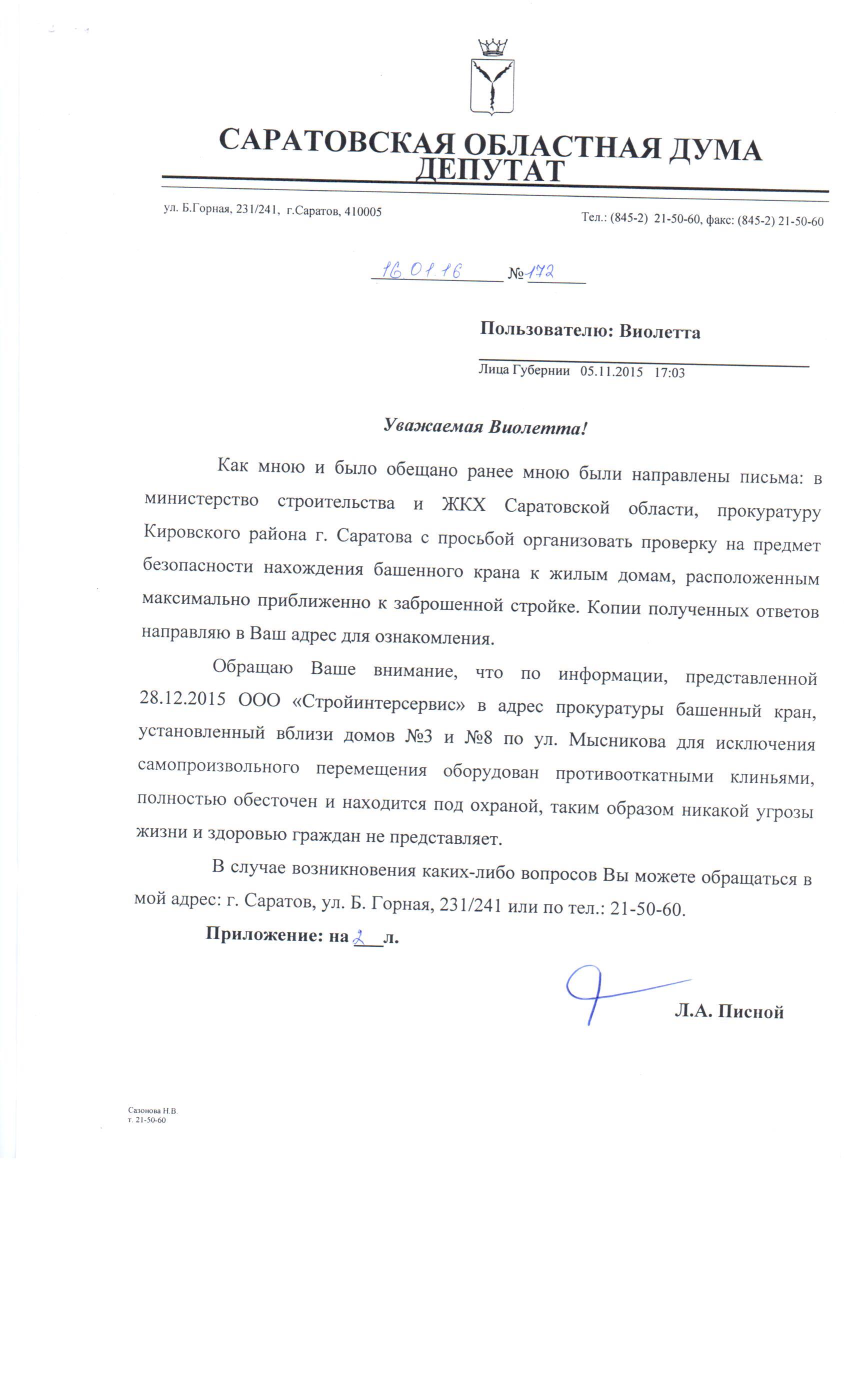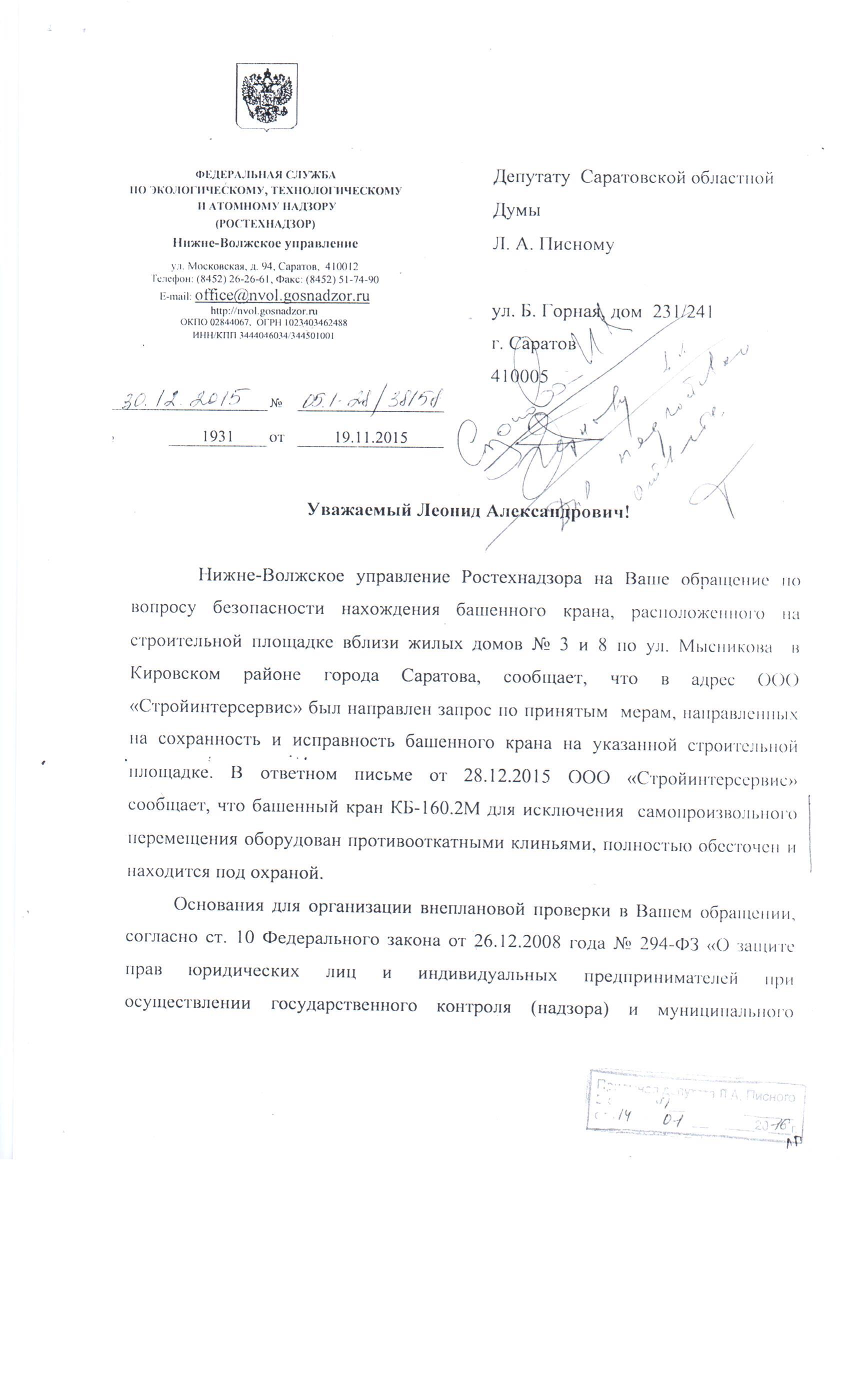 Леонид Александрович,обращаюсь к Вам с просьбой о проведении проверки башенного крана,который находиться на заброшенной стройке по адресу Батавина,дом -?.Кран стоит напротив жилого дома по адресу Мысникова 8 и Мысникова 3,стройка заброшена уже очень давно,3 года,как не ведутся работы,тех.работы на кране я думаю не производит,очень страшно за свою безопасность.