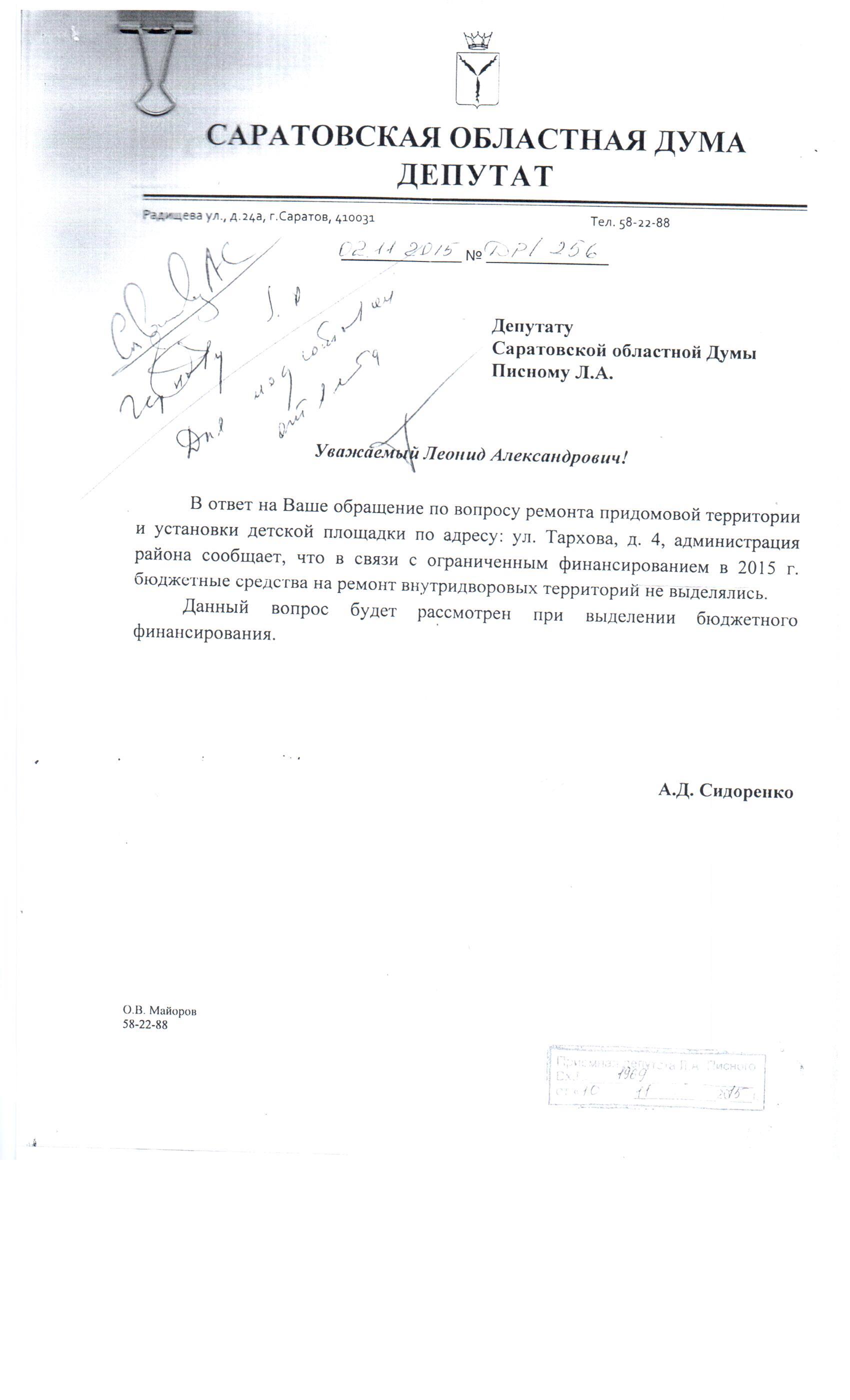 Уважаемый Леонид Александрович!Огромное Вам спасибо за детскую площадку! Ни кто даже и не думал,что это возможно, вы доказали обратное!!! Я радуюсь больше чем ребенок! У меня один вопрос:где летом брать песок для песочницы? Желаю вам огромного здоровья и много сил в помощи нам,простому народу! Елена с Тархова 4. установили 09.11.2015 Хотелось бы еще узнать о придворовой территории,возможно ли это в будующем,в грязи попрежнему утопаем.